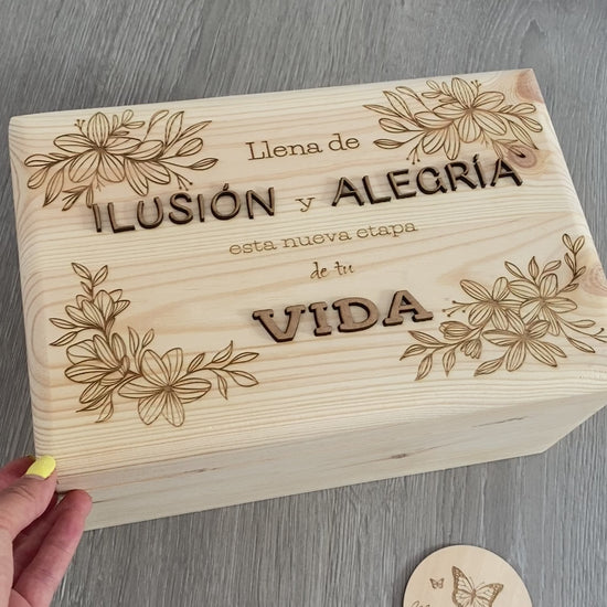 Esta elegante caja de madera maciza ha sido cuidadosamente diseñada como un regalo especial de jubilación. En la tapa superior, un delicado grabado láser de flores decora la superficie, acompañando la frase: “Llena de ilusión y alegría esta nueva etapa de tu vida”. Las palabras ilusión, alegría y vida están destacadas en relieve con MDF, aportando profundidad y simbolismo.