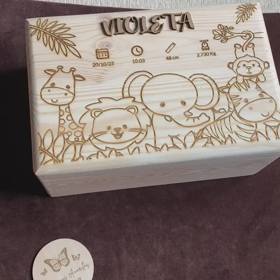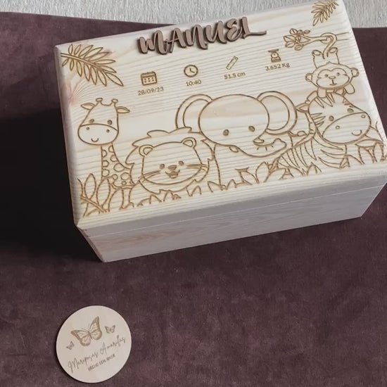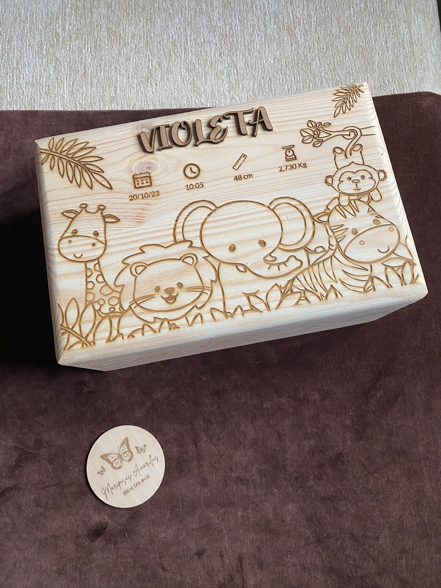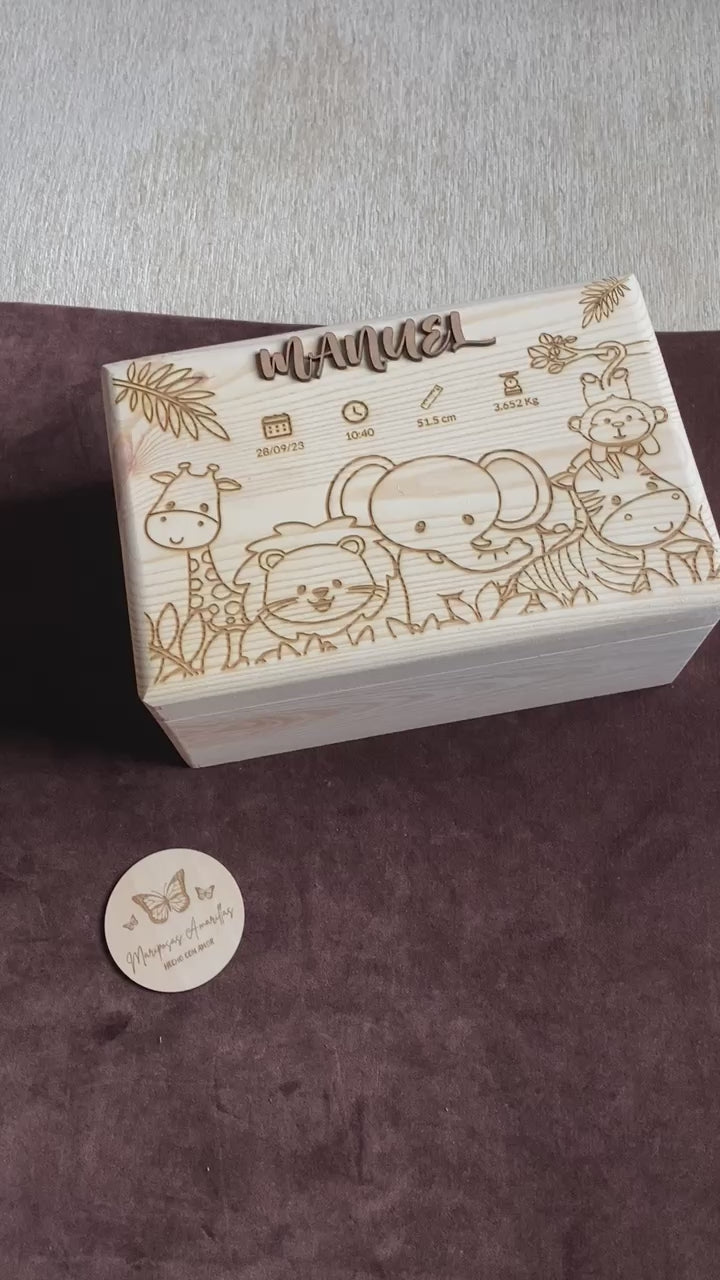 La decoración está inspirada en el mundo safari, con divertidos animalitos como una jirafa, un león y un elefante que le dan un aire tierno y aventurero. Perfecta para conservar recuerdos como la primera ropita, la pulsera del hospital, fotos, o cualquier tesoro de sus primeros días.