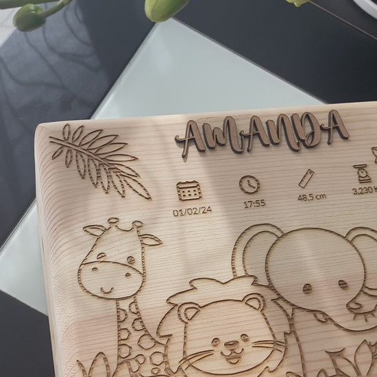 Guarda los recuerdos más valiosos del nacimiento de tu bebé en esta encantadora caja de pino maciza con tapa personalizada. El diseño se encuentra en la tapa: el nombre del bebé en MDF en relieve aporta un toque destacado y original, acompañado de los datos de nacimiento grabados con láser (fecha, hora, peso y longitud).