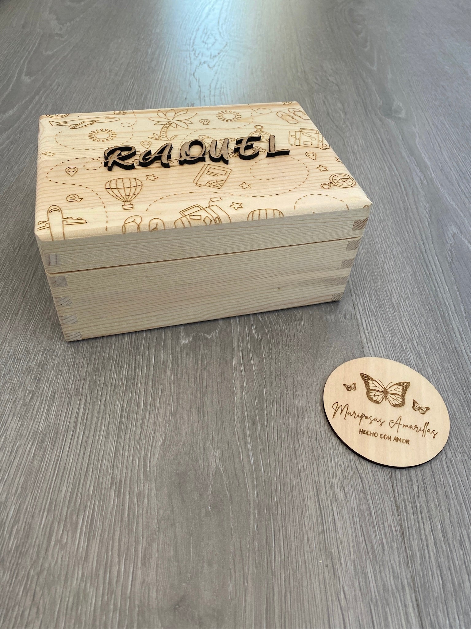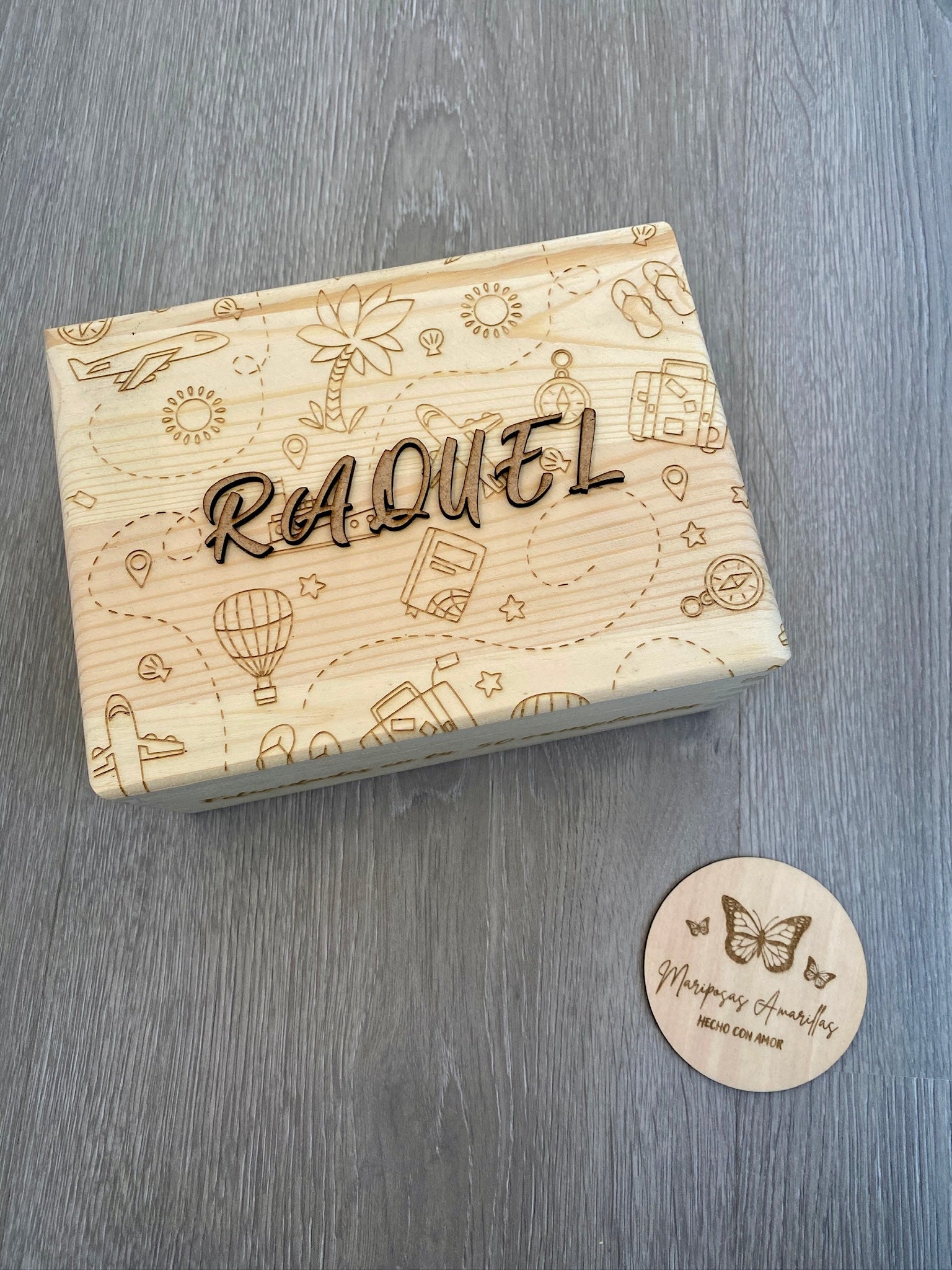 Fabricada en madera de pino macizo, esta caja combina resistencia, calidez y un diseño lleno de inspiración. En la tapa superior luce un grabado con motivos de viaje —como mapas, maletas o aviones— y puede personalizarse con el nombre que elijas, el cual se coloca en relieve de MDF, destacando como protagonista del diseño.