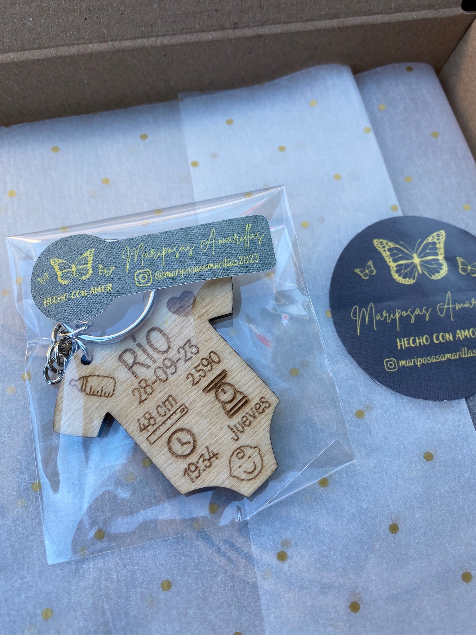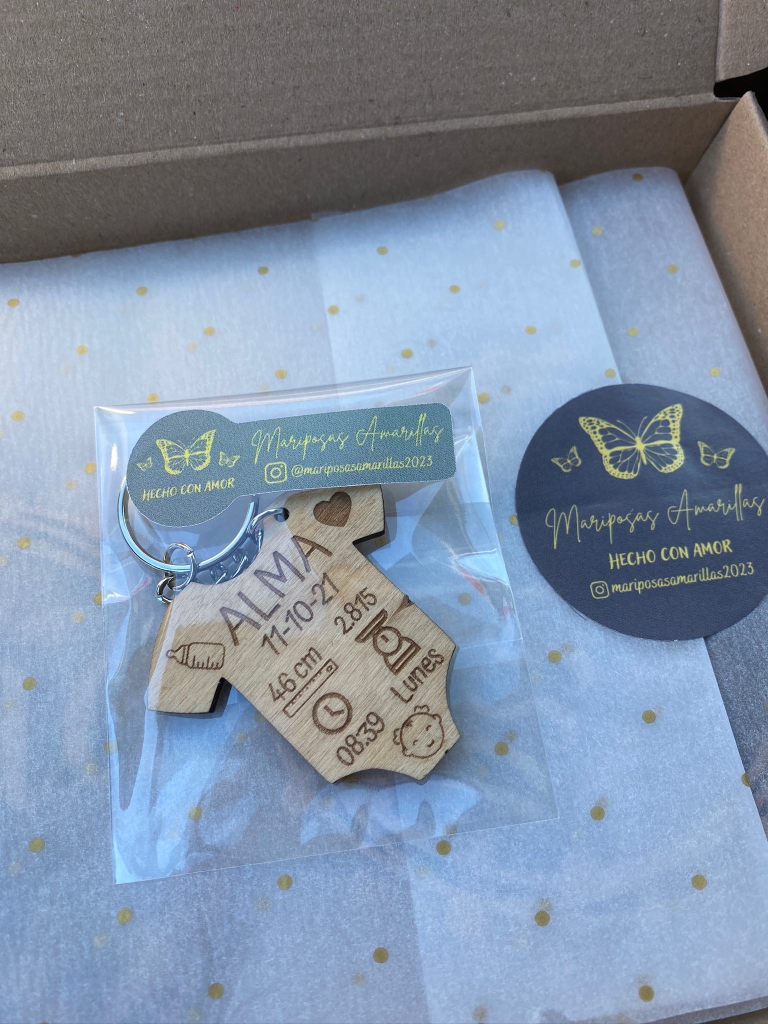 Celebra la llegada de un nuevo miembro a la familia con este tierno llavero de madera de abedul, con forma de body y personalizado con el nombre y los datos de nacimiento del bebé (fecha, hora, peso y medida). Un recuerdo único, ideal para regalar a padres, abuelos o padrinos.