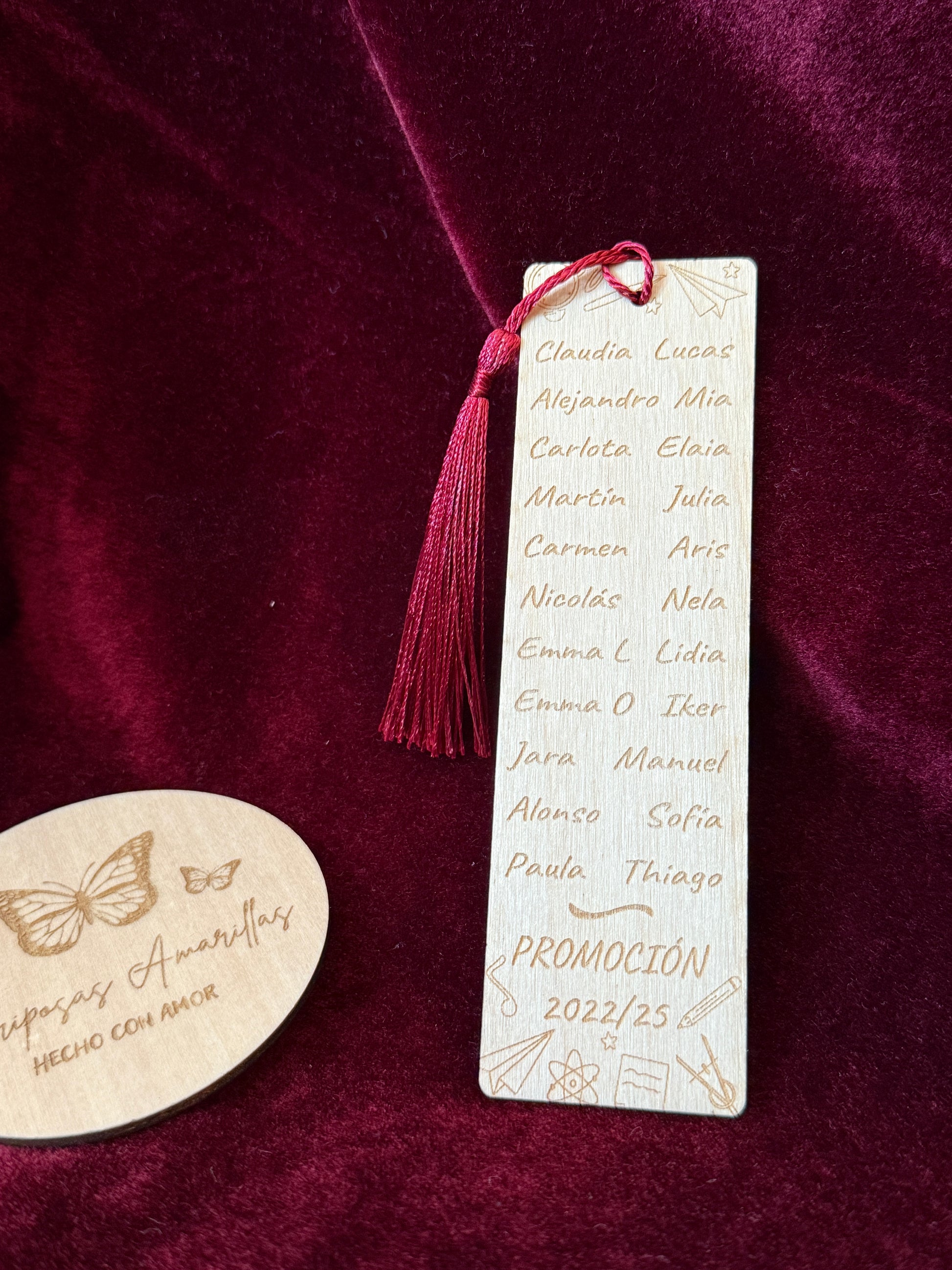 En la parte trasera, también grabada con láser, se repiten los motivos decorativos y se añade el listado personalizado de los alumnos de la clase, convirtiéndolo en un recuerdo para toda la vida.