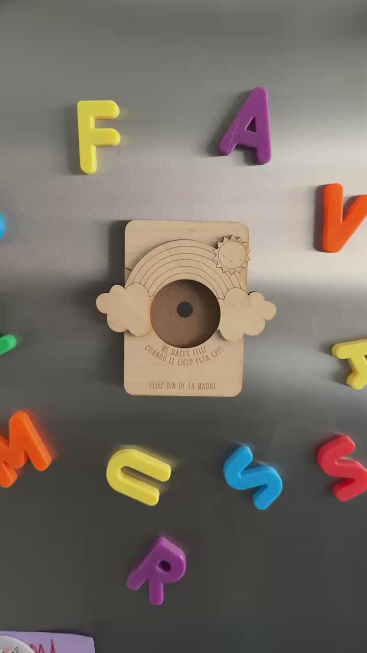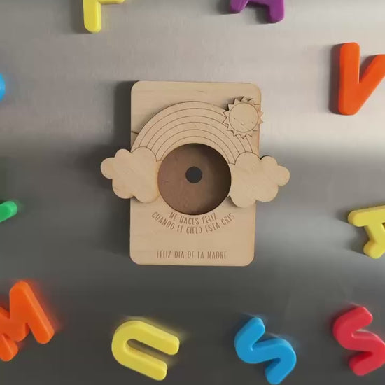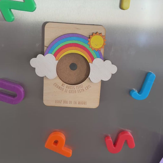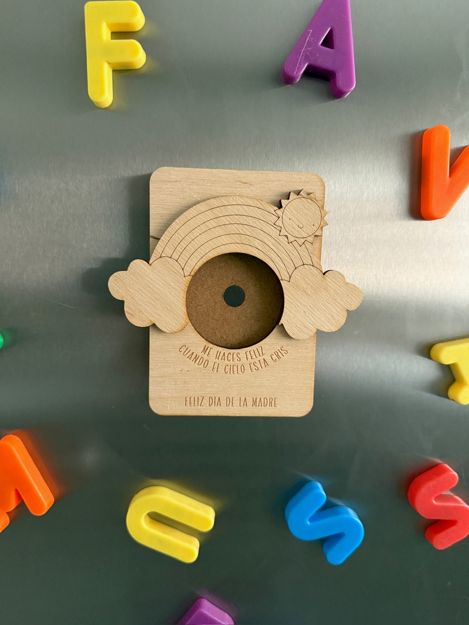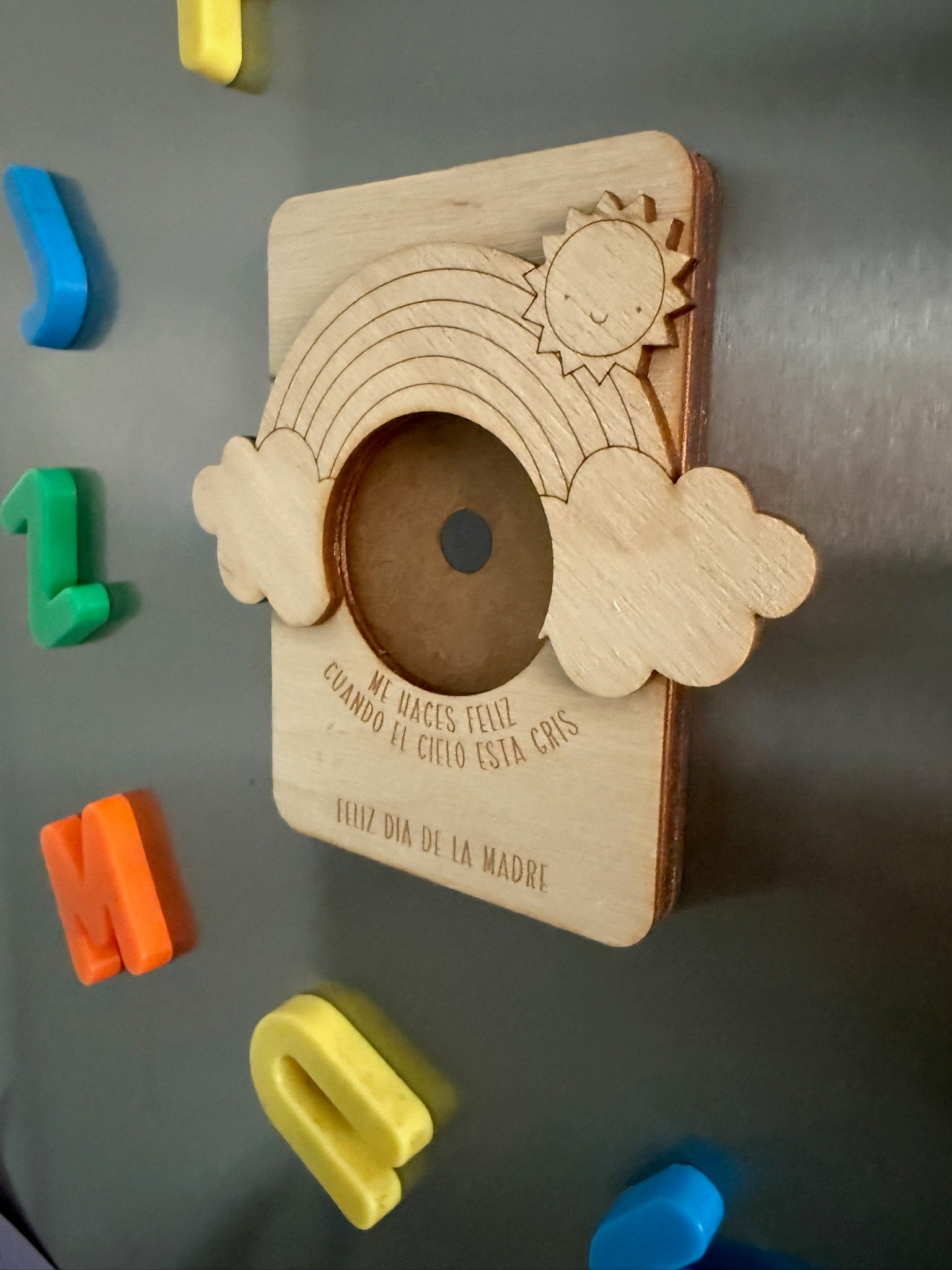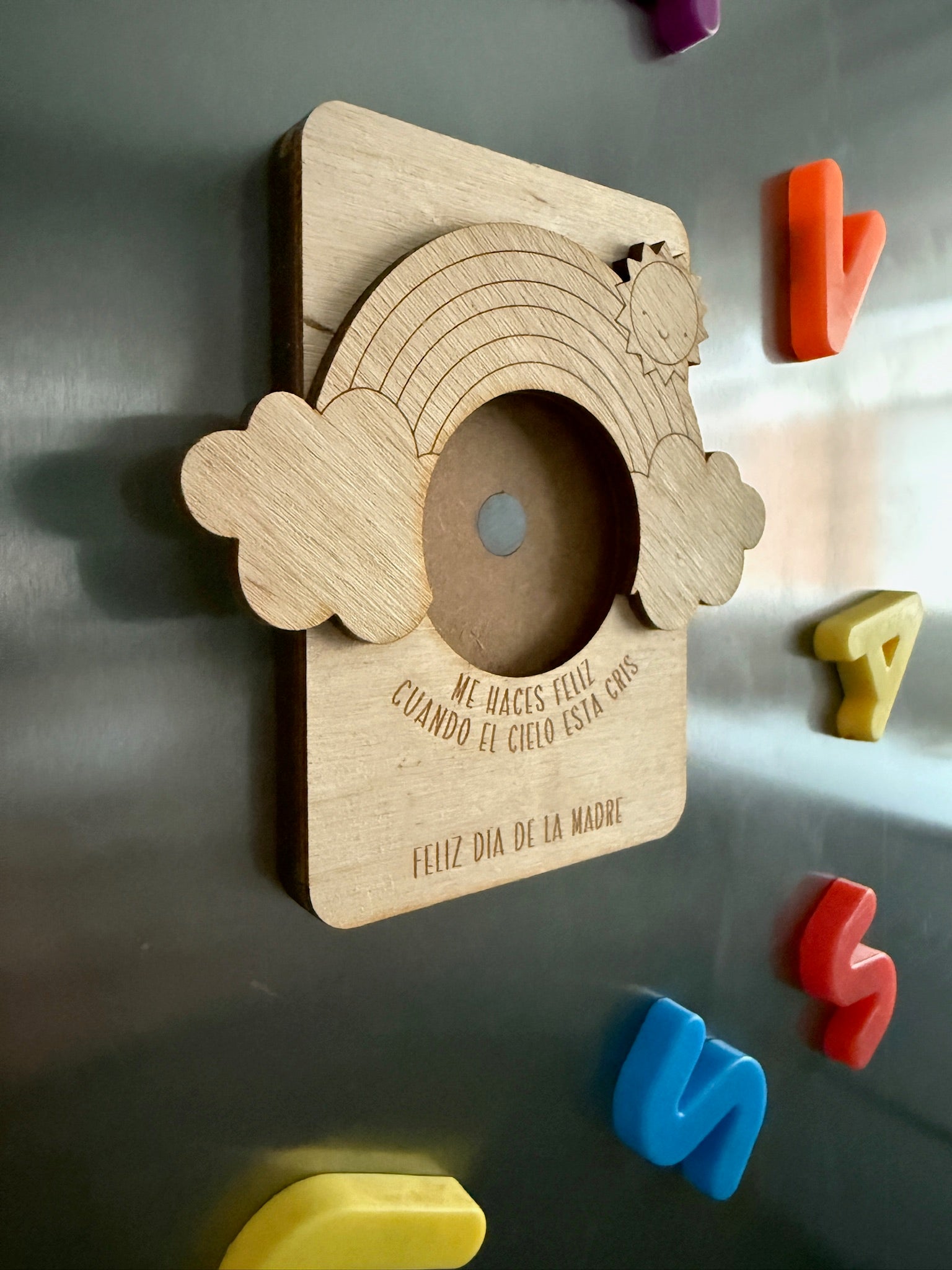 Hazle saber a mamá cuánto ilumina tu vida con este adorable marco imantado. Fabricado en madera de abedul y decorado con un colorido arco iris y un sol sonriente, este marco lleva el mensaje: “Me haces feliz cuando el cielo está gris”.