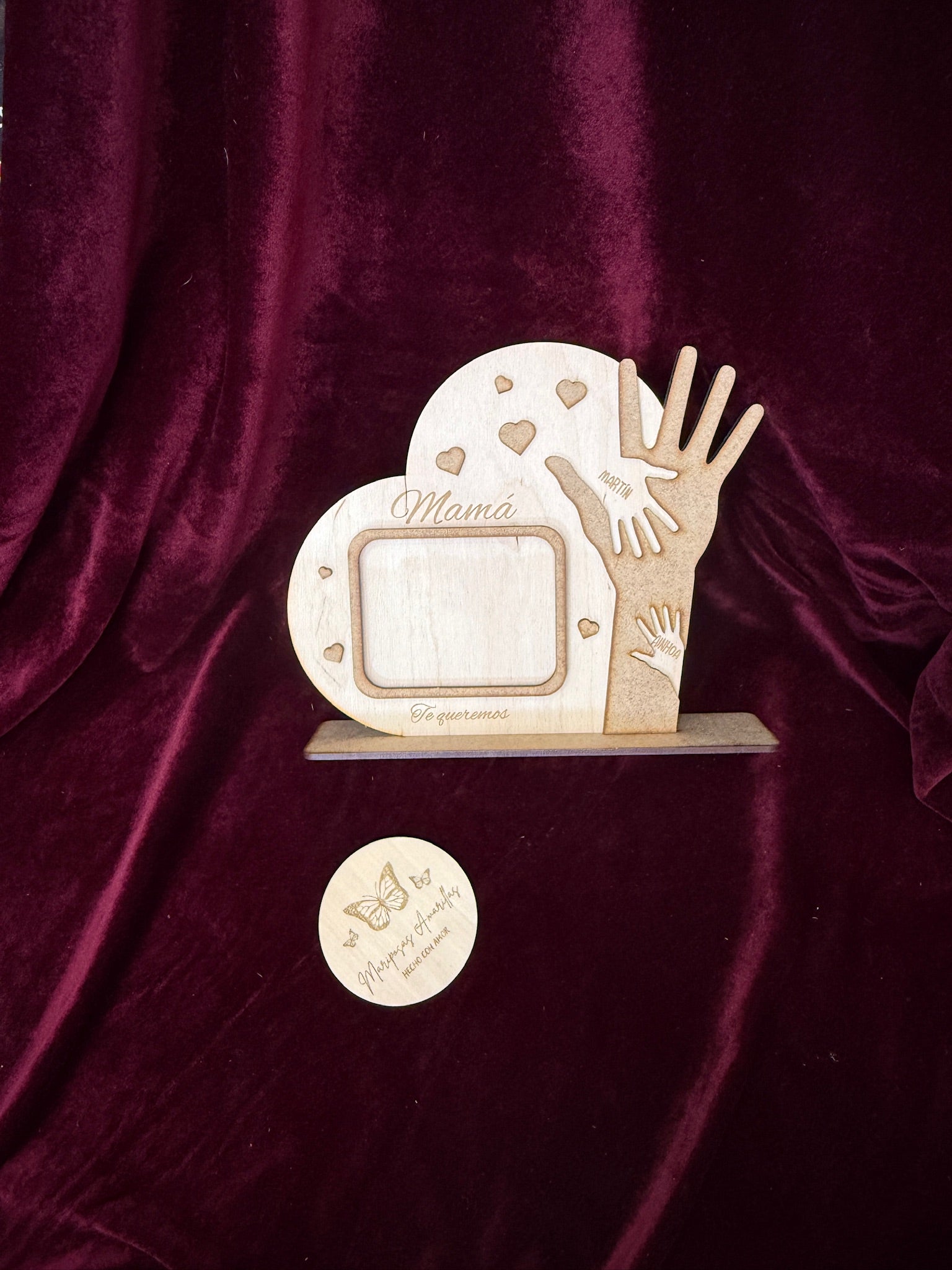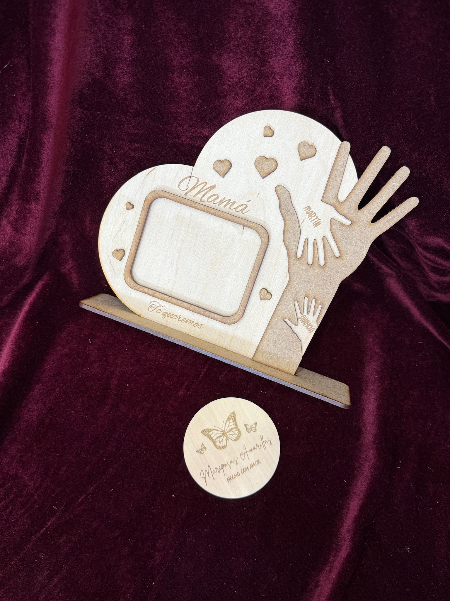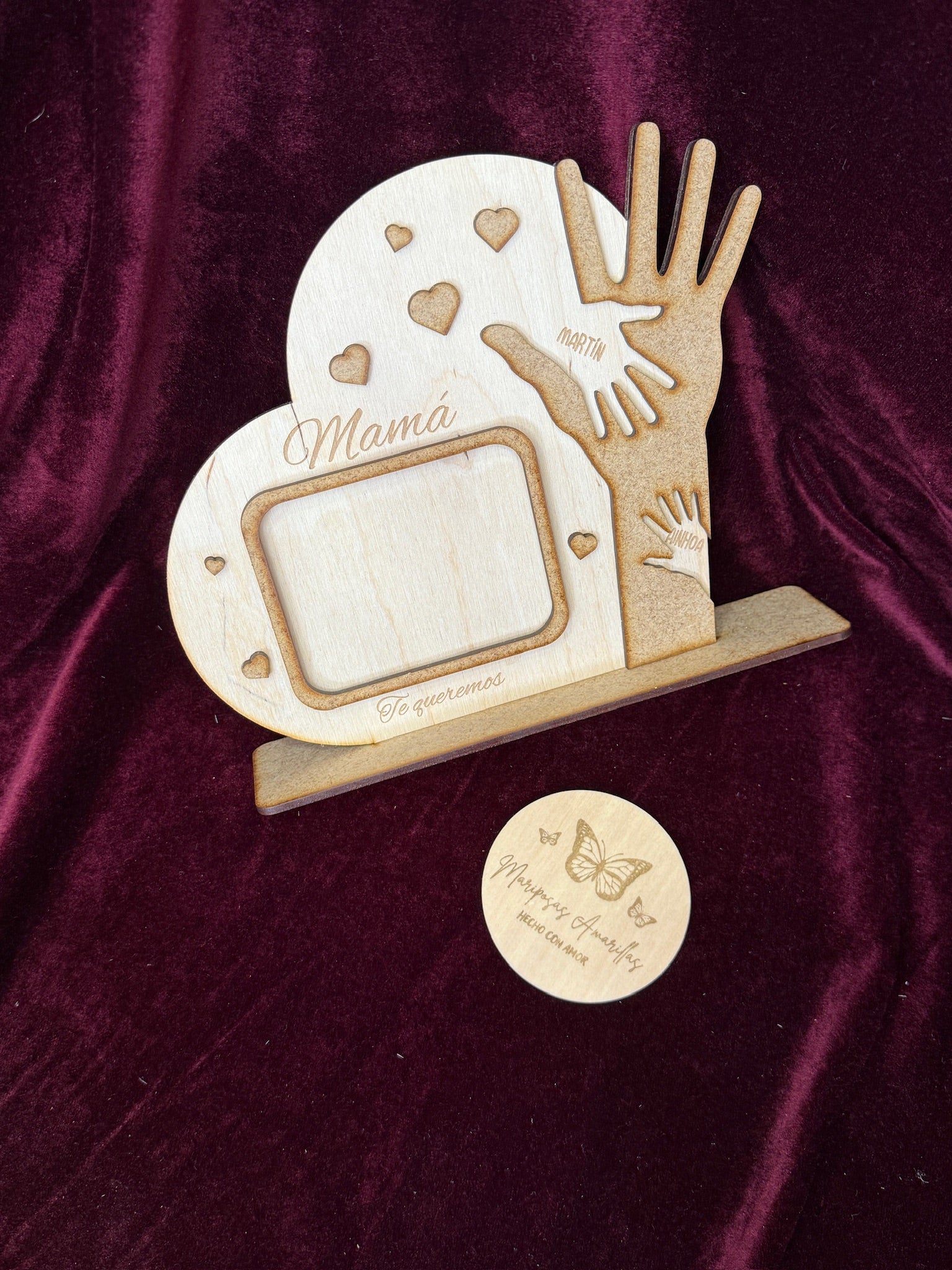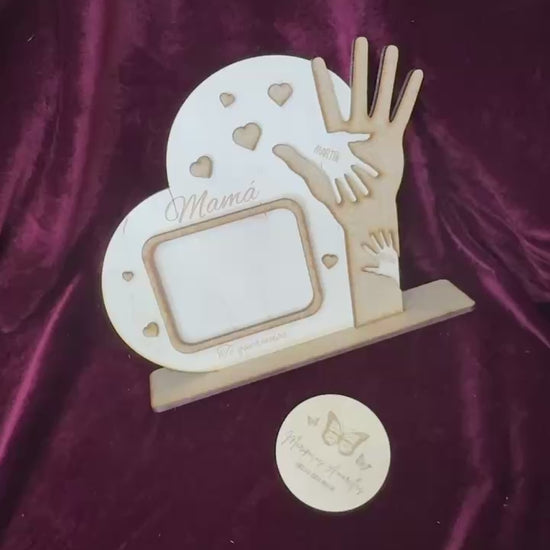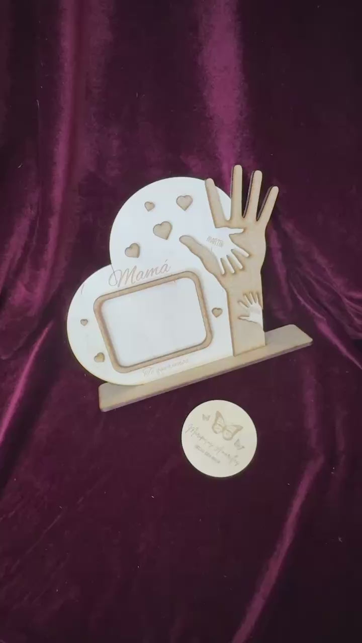 Un recuerdo lleno de amor y simbolismo, creado para emocionar. Este marco decorativo en forma de corazón está elaborado en madera de abedul natural y combina un diseño cálido con detalles personalizados que lo hacen único. En su interior, se integra una zona para colocar una fotografía especial, junto a una representación de una mano grande (la de mamá), realizada en una capa adicional de madera MDF que aporta contraste y profundidad visual. Dentro de esa mano, se encuentran las manos más pequeñas de sus hijos, grabadas con sus nombres, formando una composición tierna y significativa.
