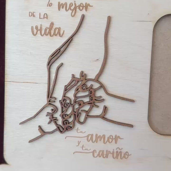 Haz aún más especial ese momento compartido con mamá con este hermoso marco de foto artesanal, ideal para el Día de la Madre o cualquier ocasión en la que quieras celebrar su amor y dedicación. Fabricado en madera natural de abedul, este marco destaca por su delicado grabado láser con una frase emotiva, acompañado de una capa en relieve de MDF que representa la tierna imagen de una mano materna sostenida por las pequeñas manos de sus hijos.