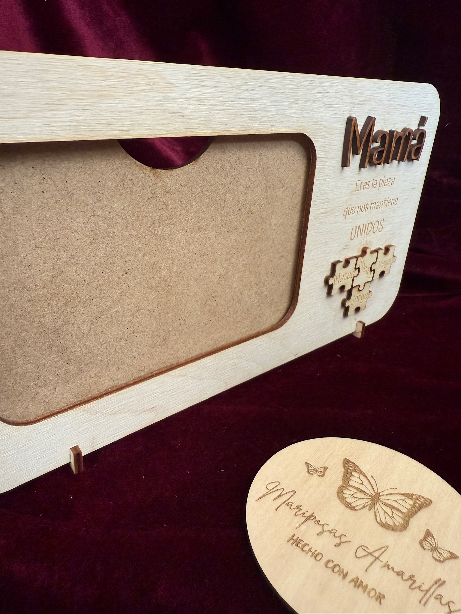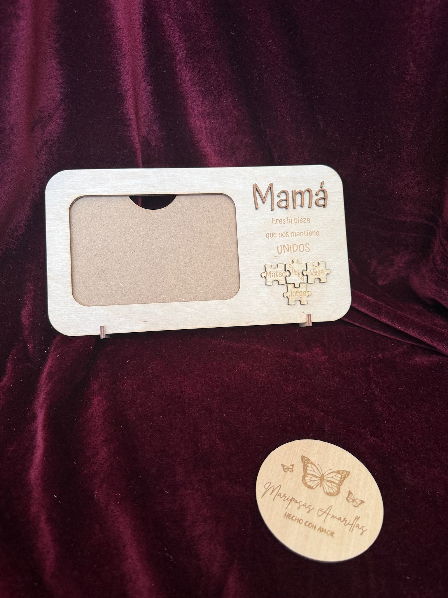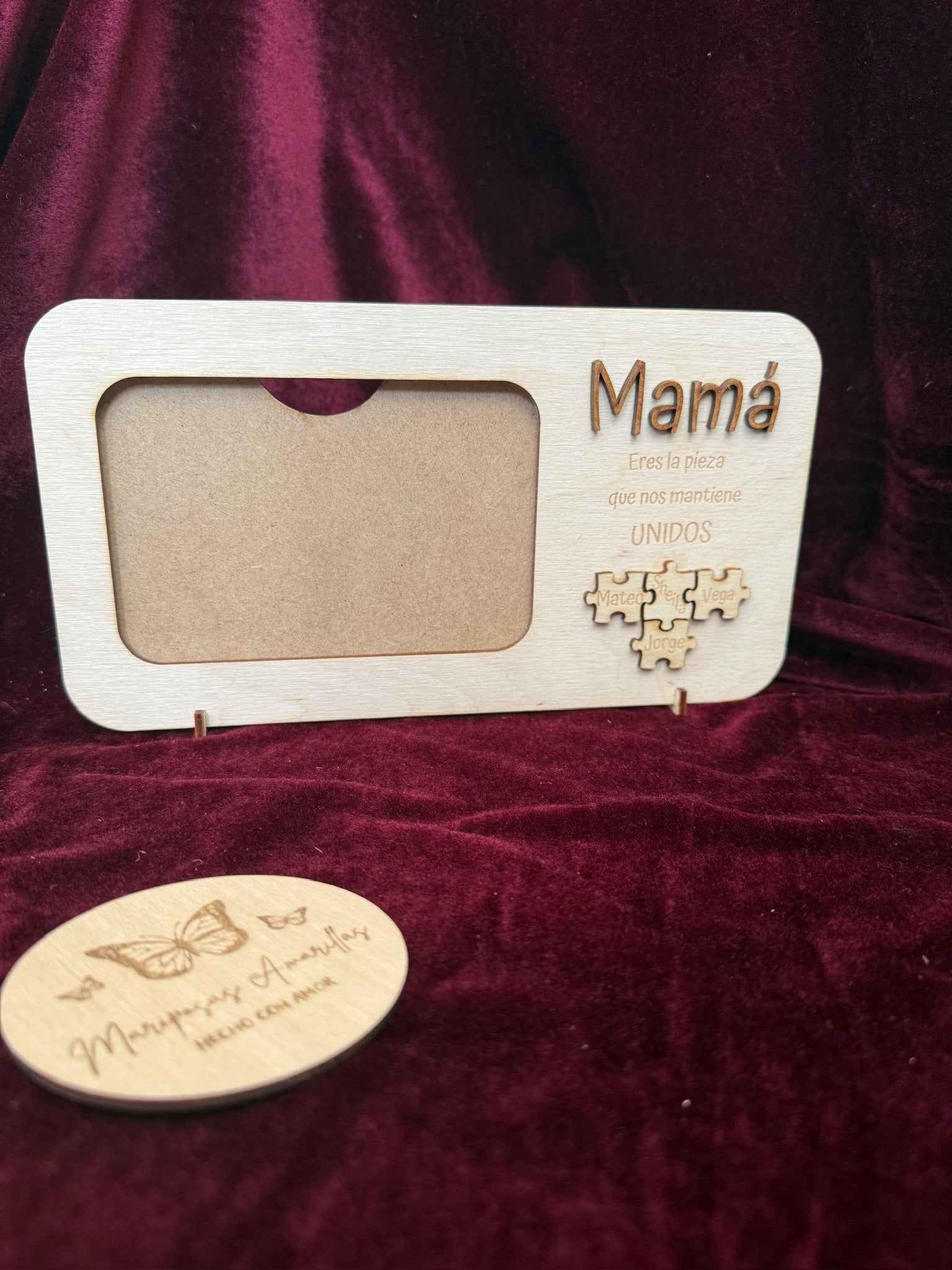 Este delicado marco de fotos, disponible en MDF o madera de abedul de 3 mm, está diseñado con la palabra “Mamá” en relieve en la parte superior y la frase “Eres la pieza que nos mantiene unidos” justo debajo.