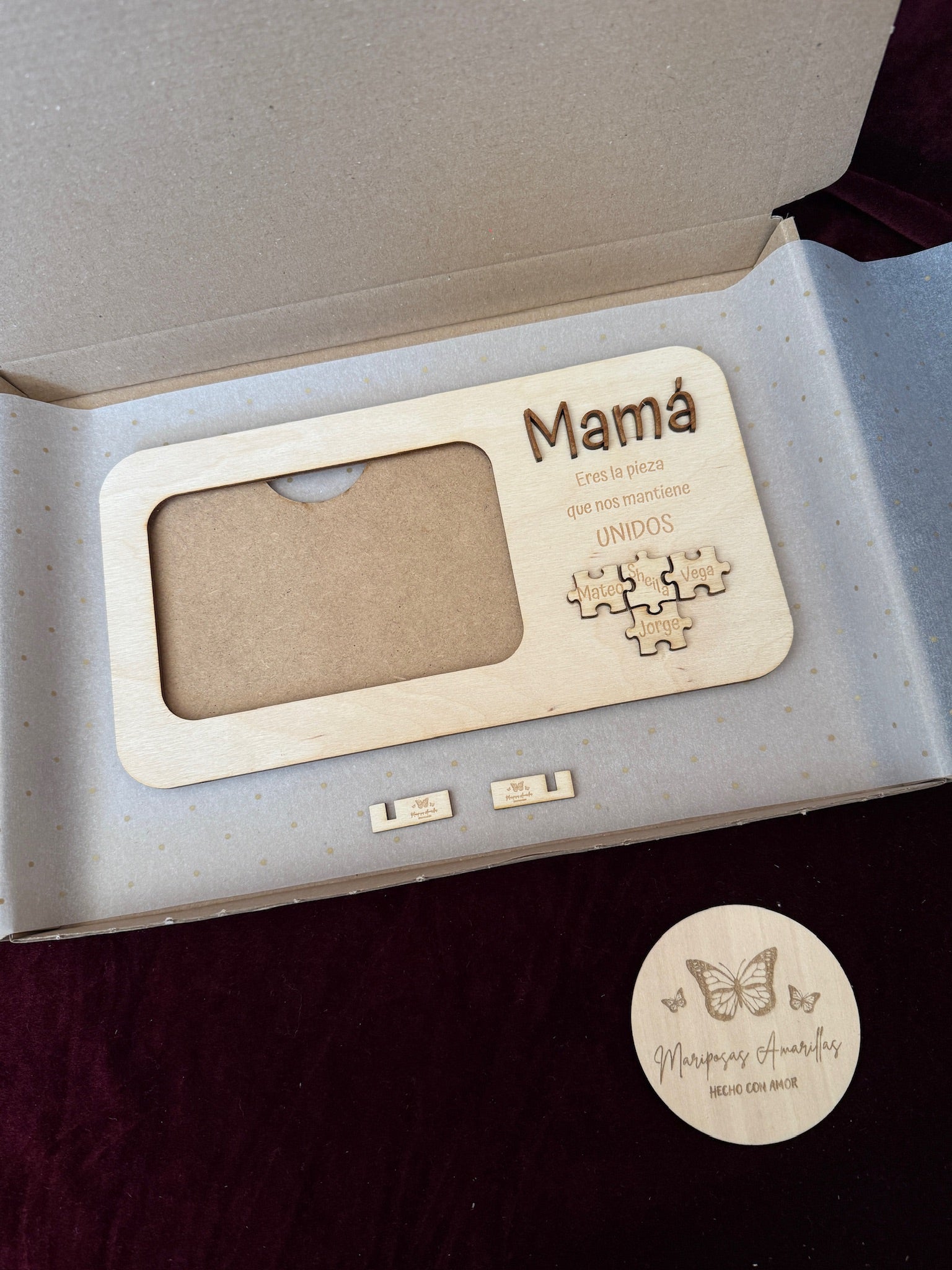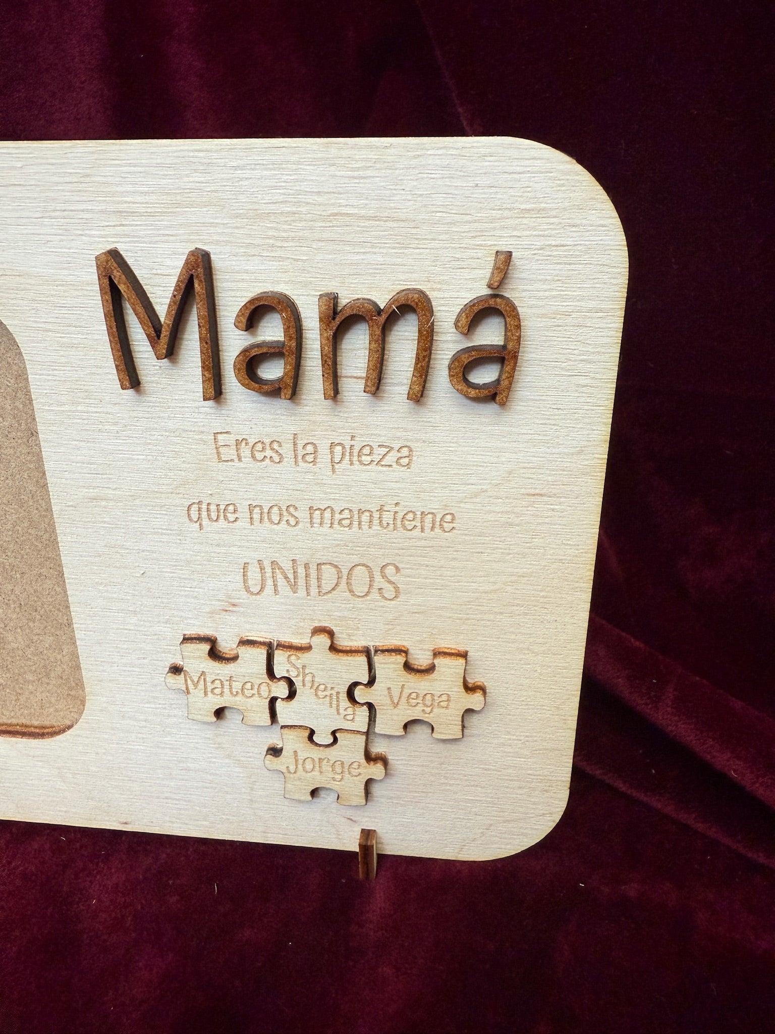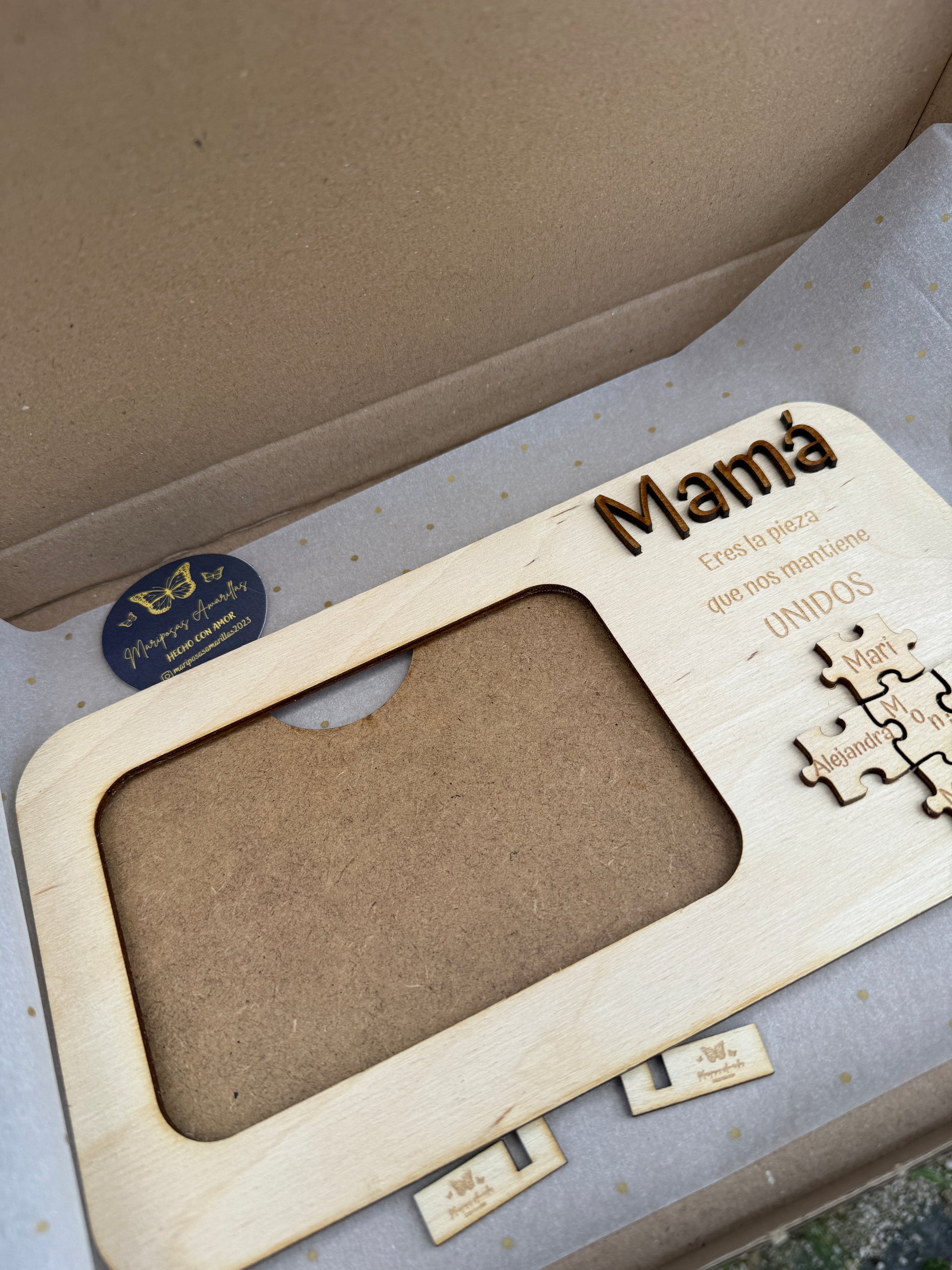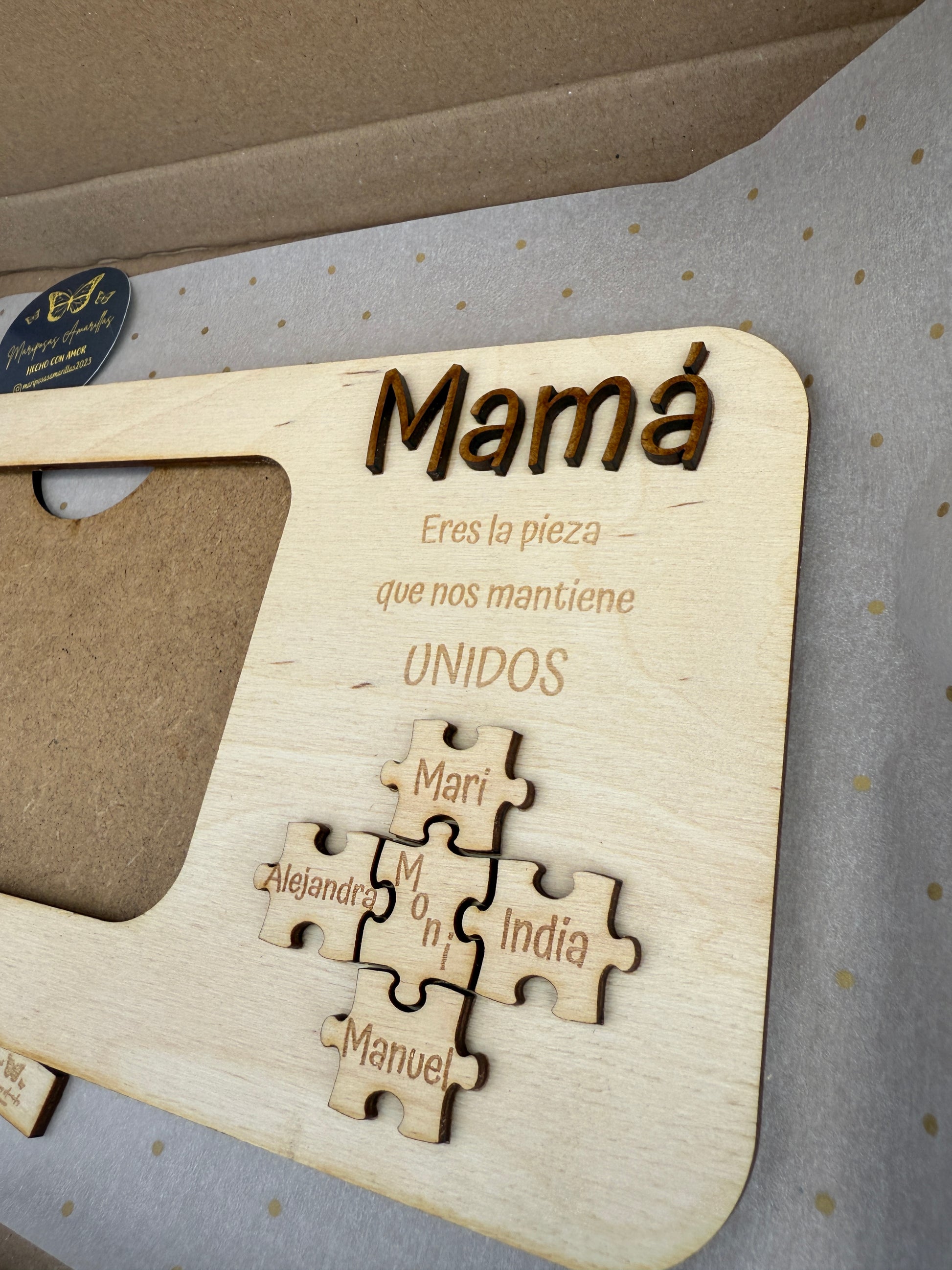 Como toque único, incluye piezas de rompecabezas también en relieve, personalizadas con los nombres de los hijos y el de mamá, representando cómo todos encajan gracias a su amor.