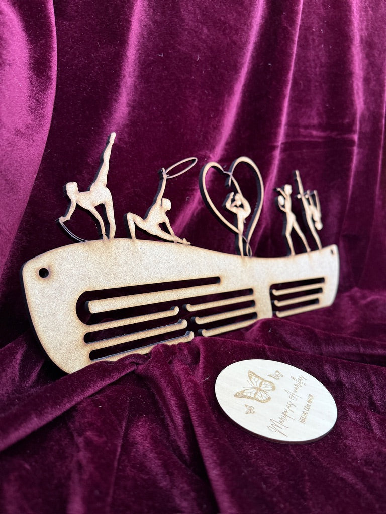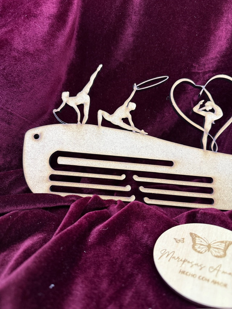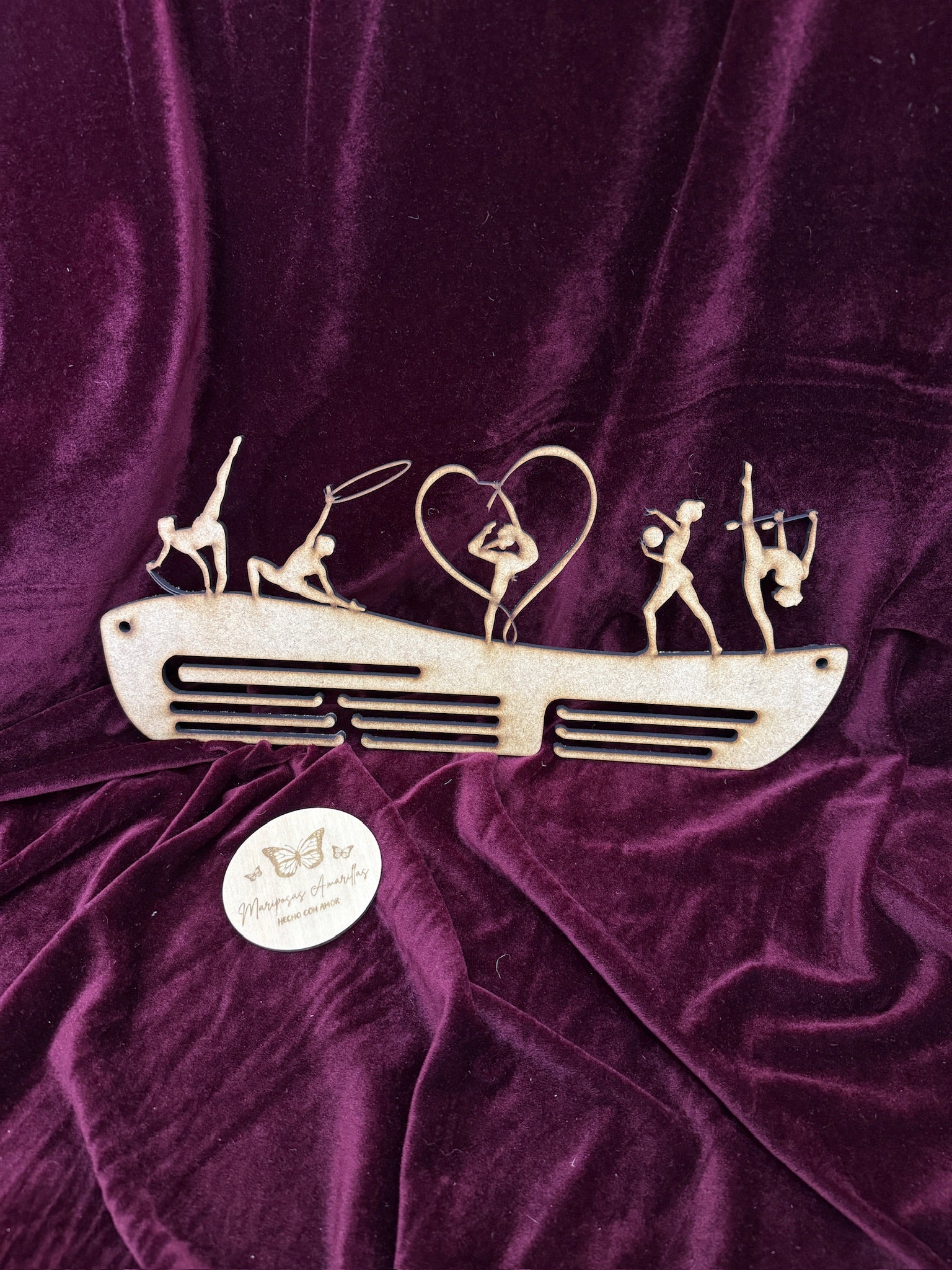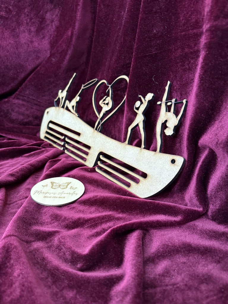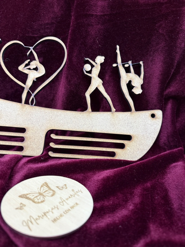Este modelo incorpora 5 figuras decorativas que representan los diferentes elementos de la gimnasia rítmica (aro, cinta, cuerda, mazas y pelota), haciendo de este medallero una pieza única y personalizada para apasionadas del deporte.