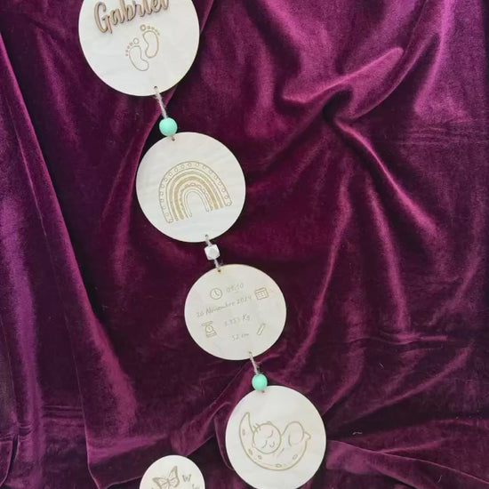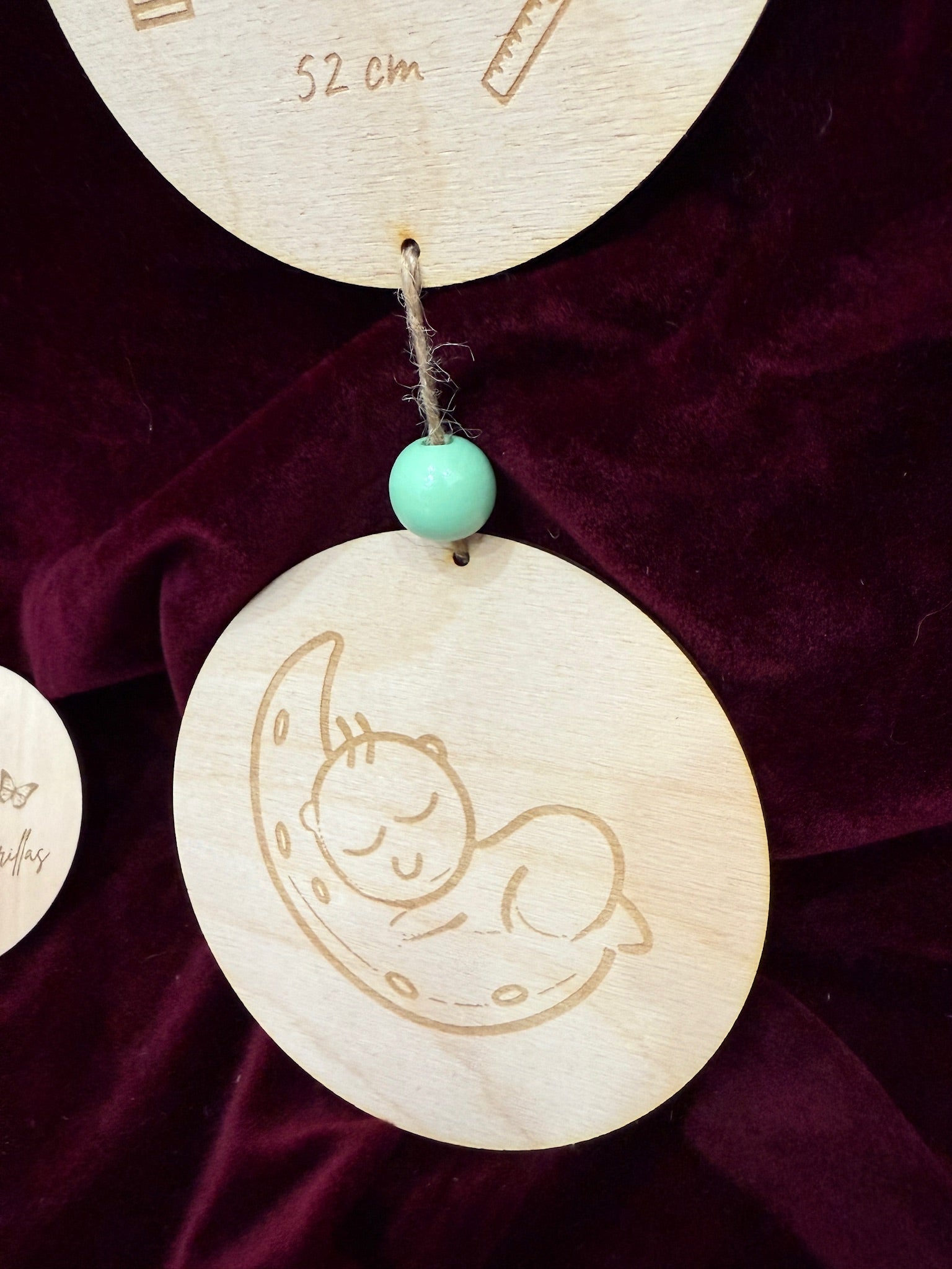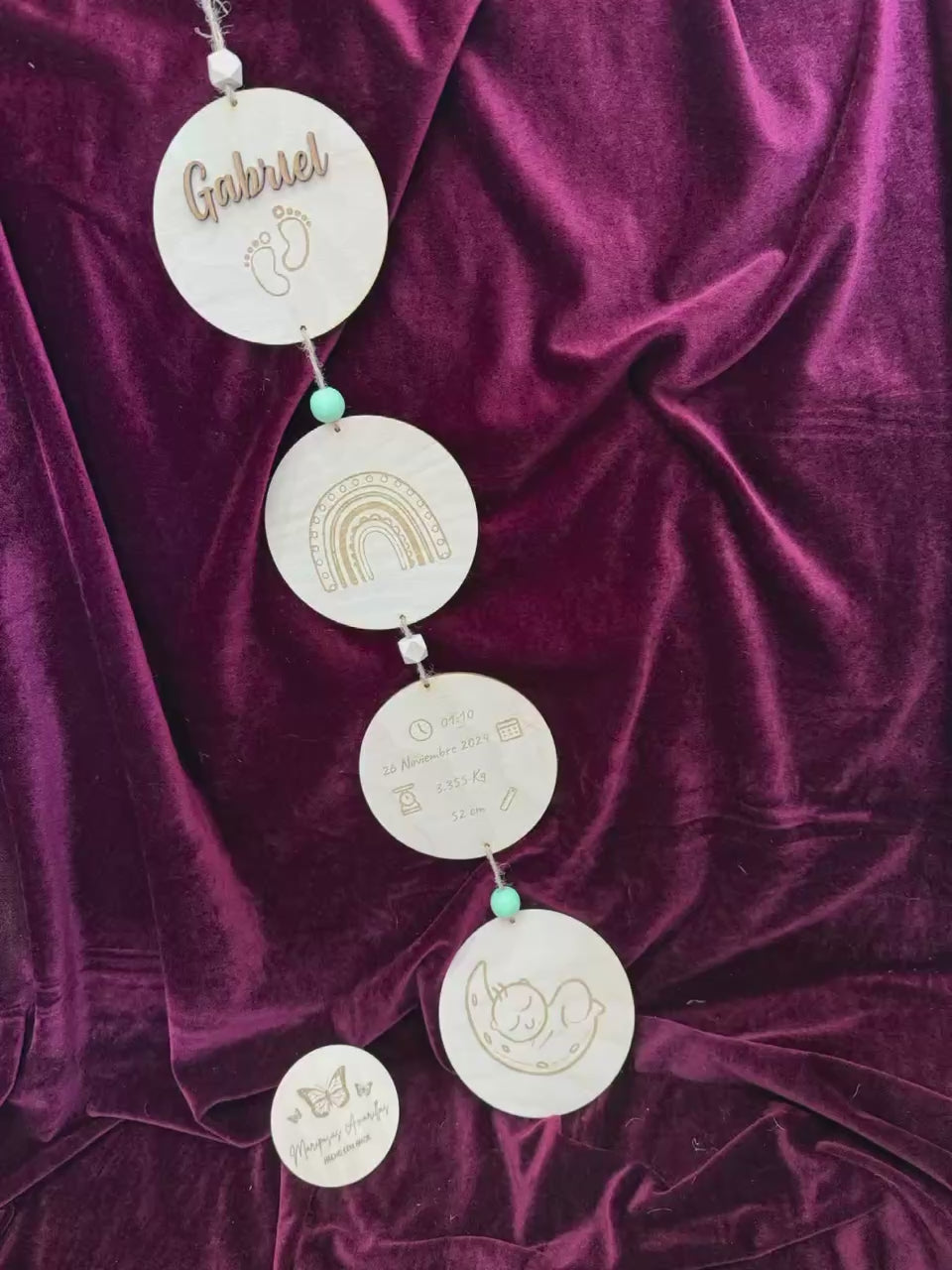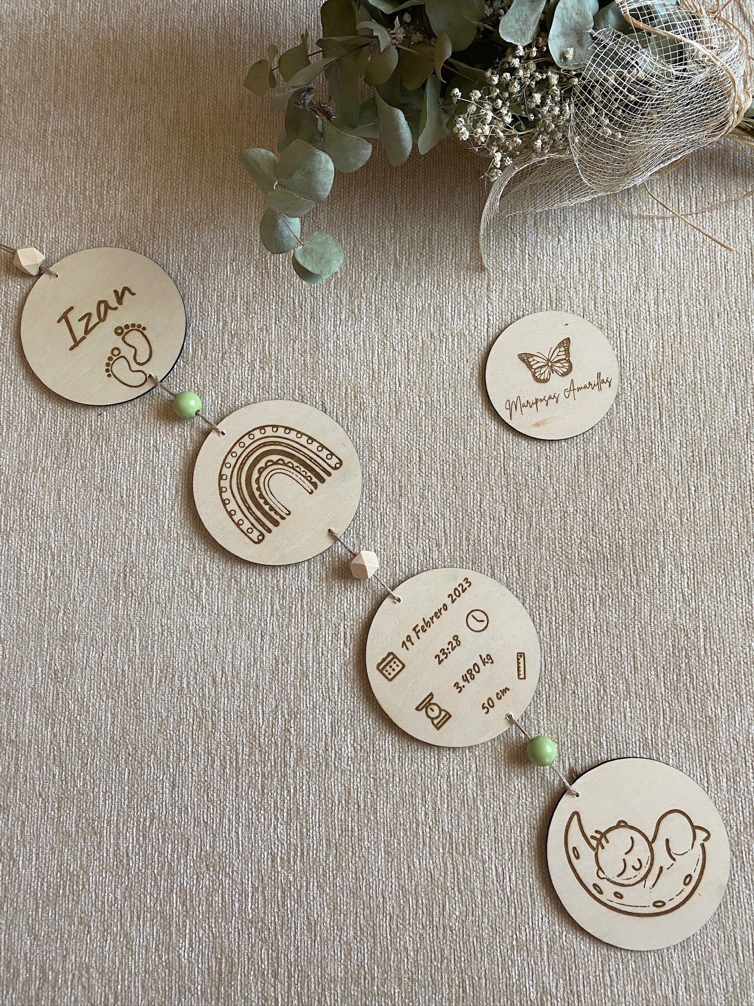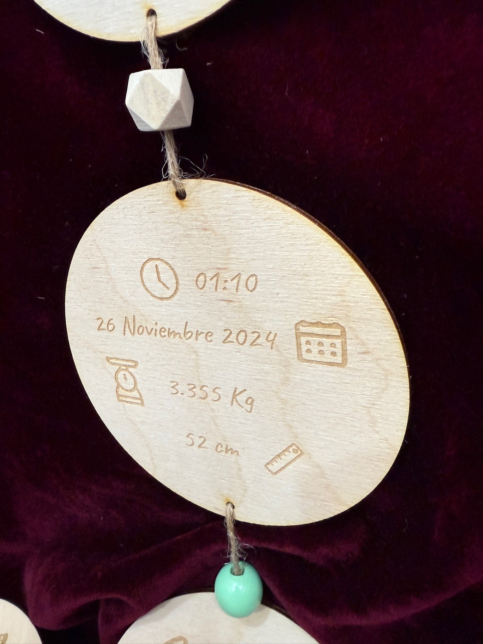 En el primer círculo, el nombre del bebé aparece en relieve (realizado en MDF) junto a unos pequeños pies grabados. El segundo círculo muestra un bonito arcoíris grabado con láser. En el tercero se graban todos los datos de nacimiento: fecha, hora, peso y longitud. Y en el cuarto, un dulce grabado de un bebé durmiendo cierra esta pieza tan especial.