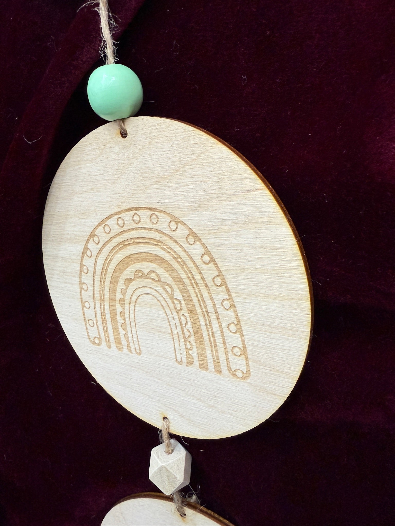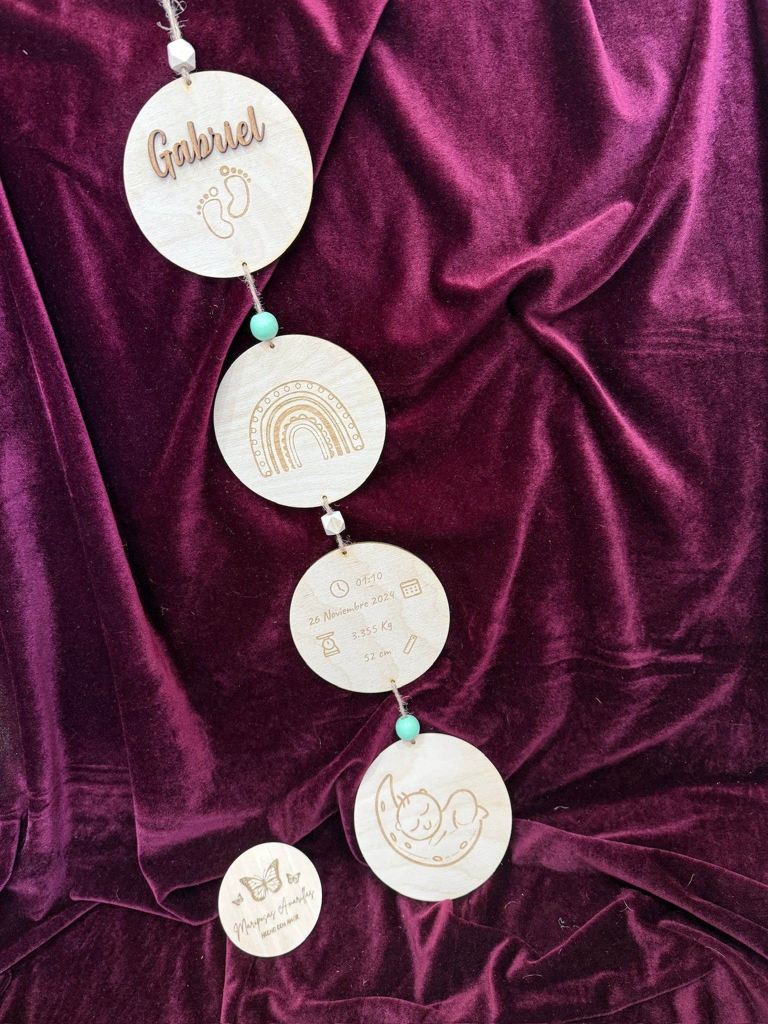 Celebra el nacimiento de tu pequeño con este delicado natalicio en forma de guirnalda, elaborado en contrachapado de abedul natural. El diseño está compuesto por cuatro círculos que cuelgan uno de otro, creando una pieza vertical, armoniosa y llena de significado.