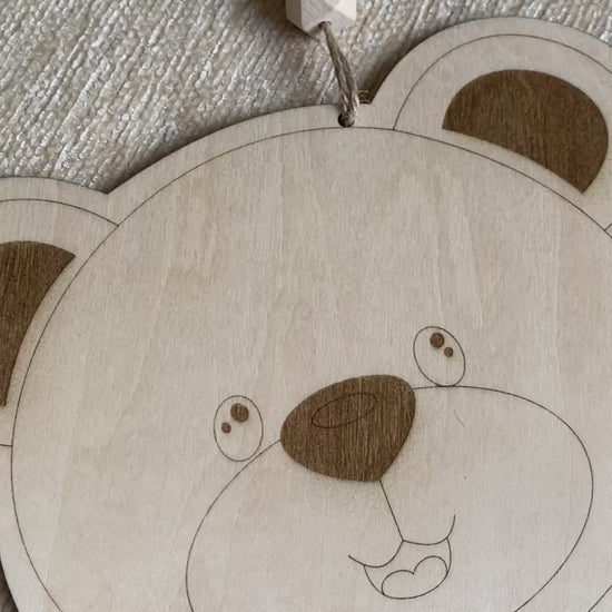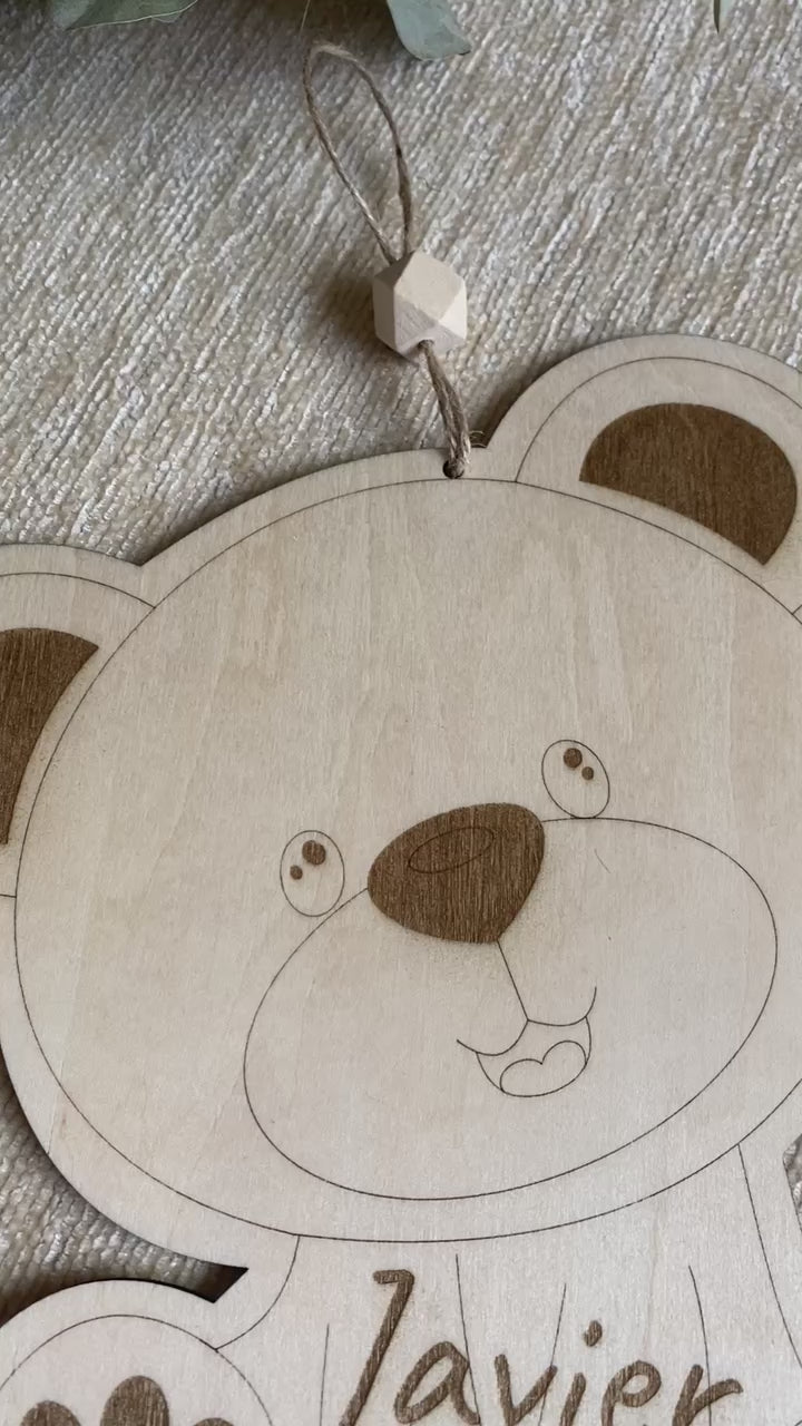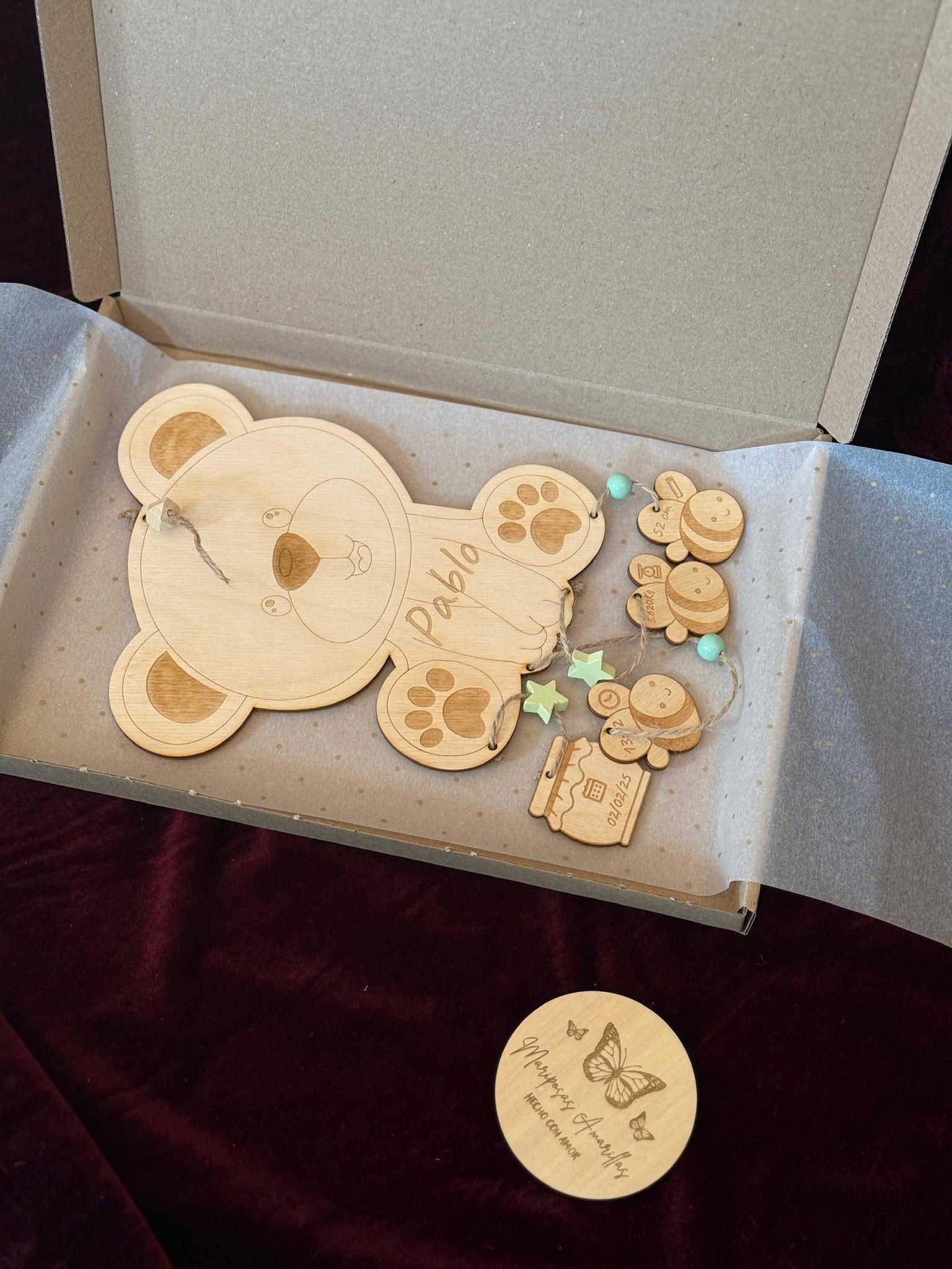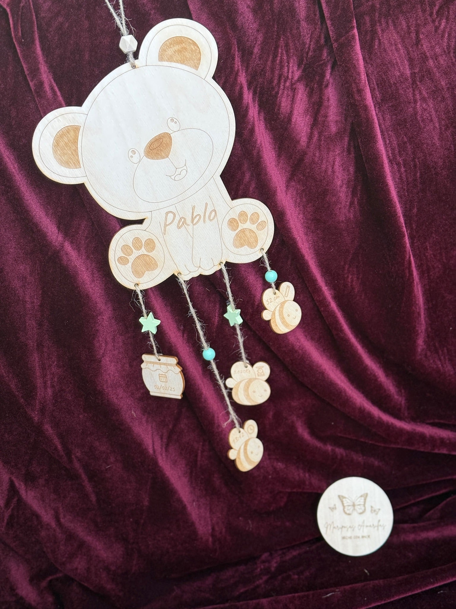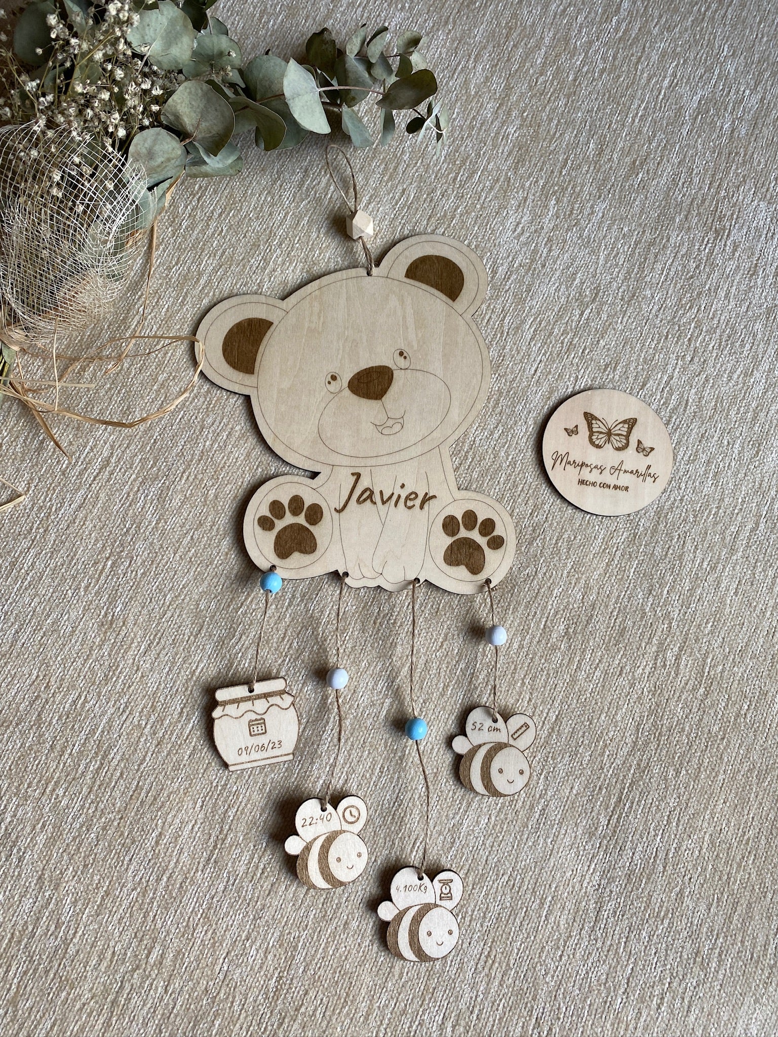 Guarda para siempre el recuerdo más tierno con este natalicio en forma de osito, elaborado en contrachapado de abedul de alta calidad. El nombre del bebé se graba con detalle sobre el cuerpo del osito, y los datos de nacimiento (fecha, hora, peso y longitud) cuelgan en forma de tres abejitas y un pequeño tarro de miel, añadiendo un toque original y encantador.