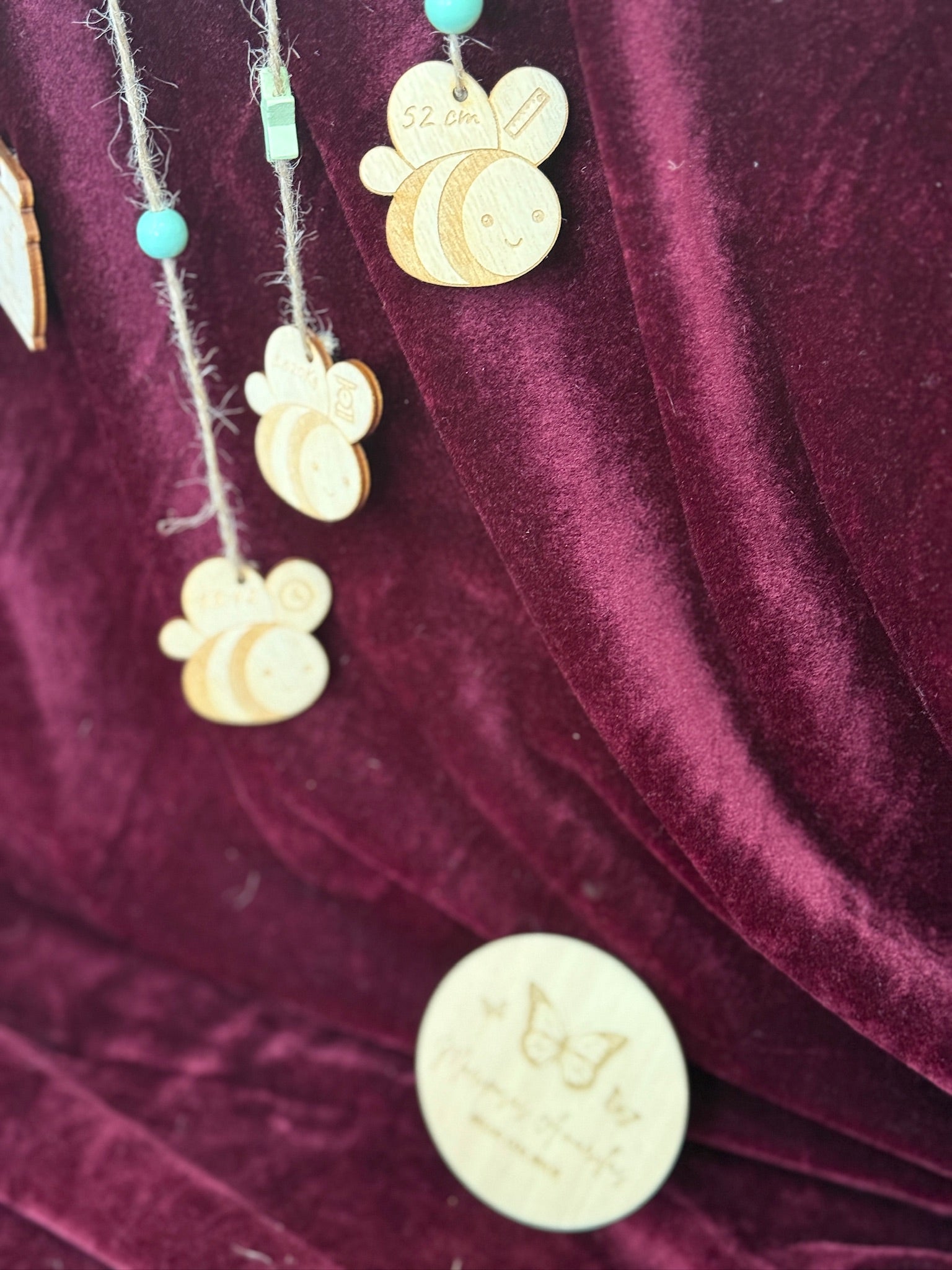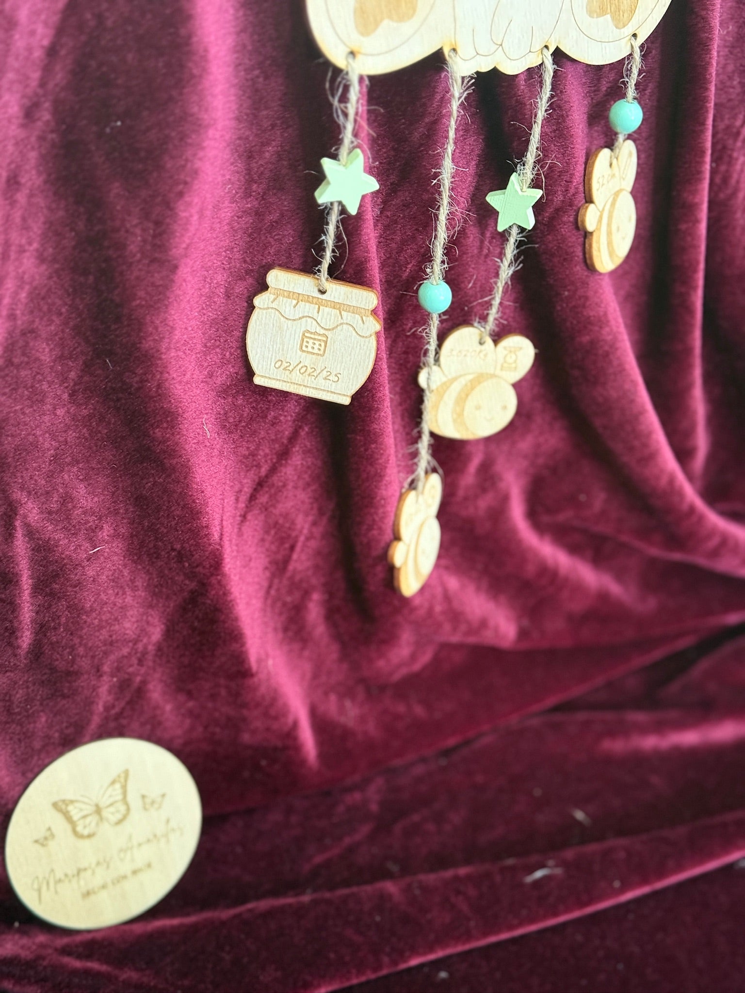• Datos de nacimiento en colgantes con forma de abejas y tarro de miel