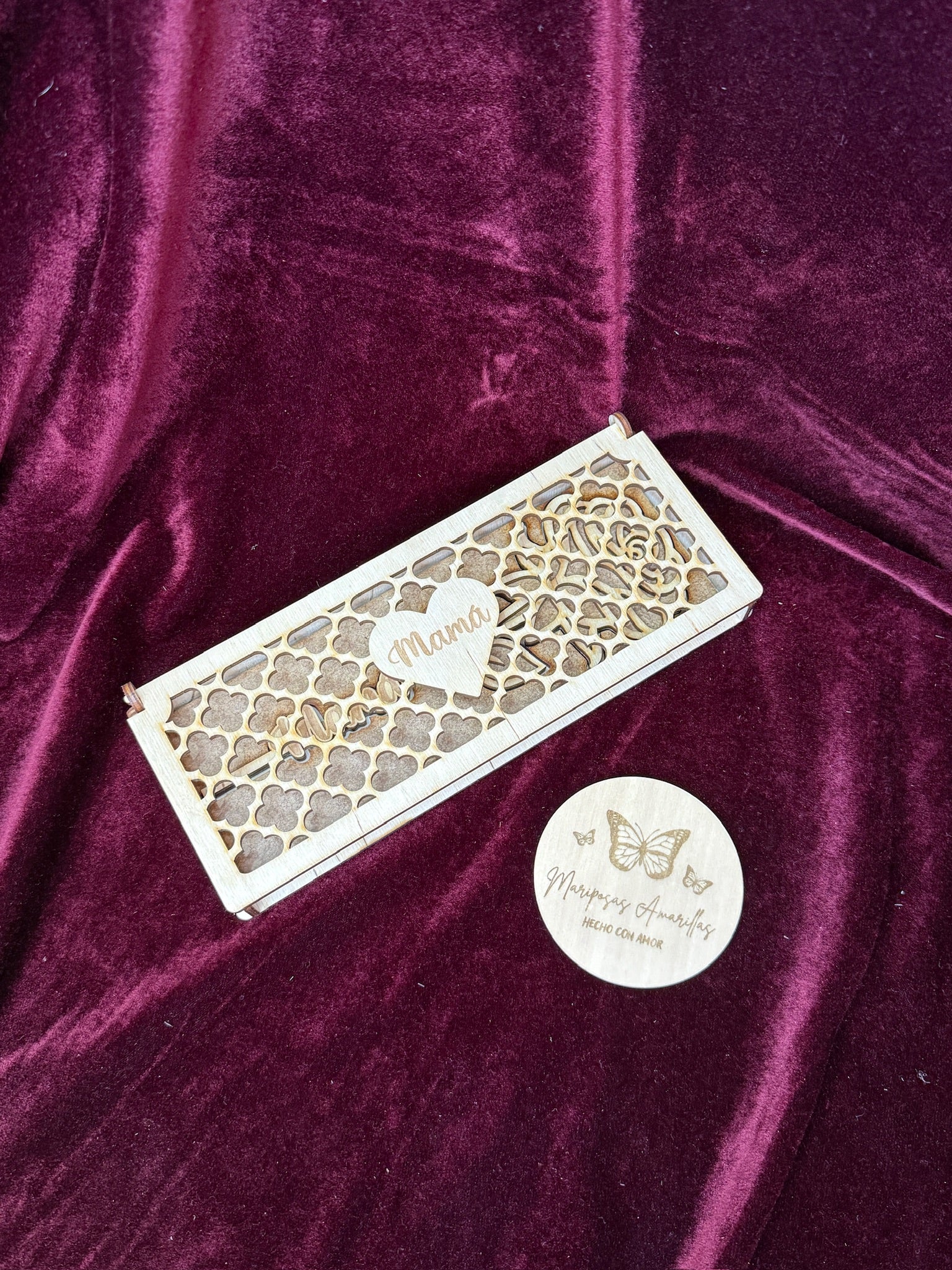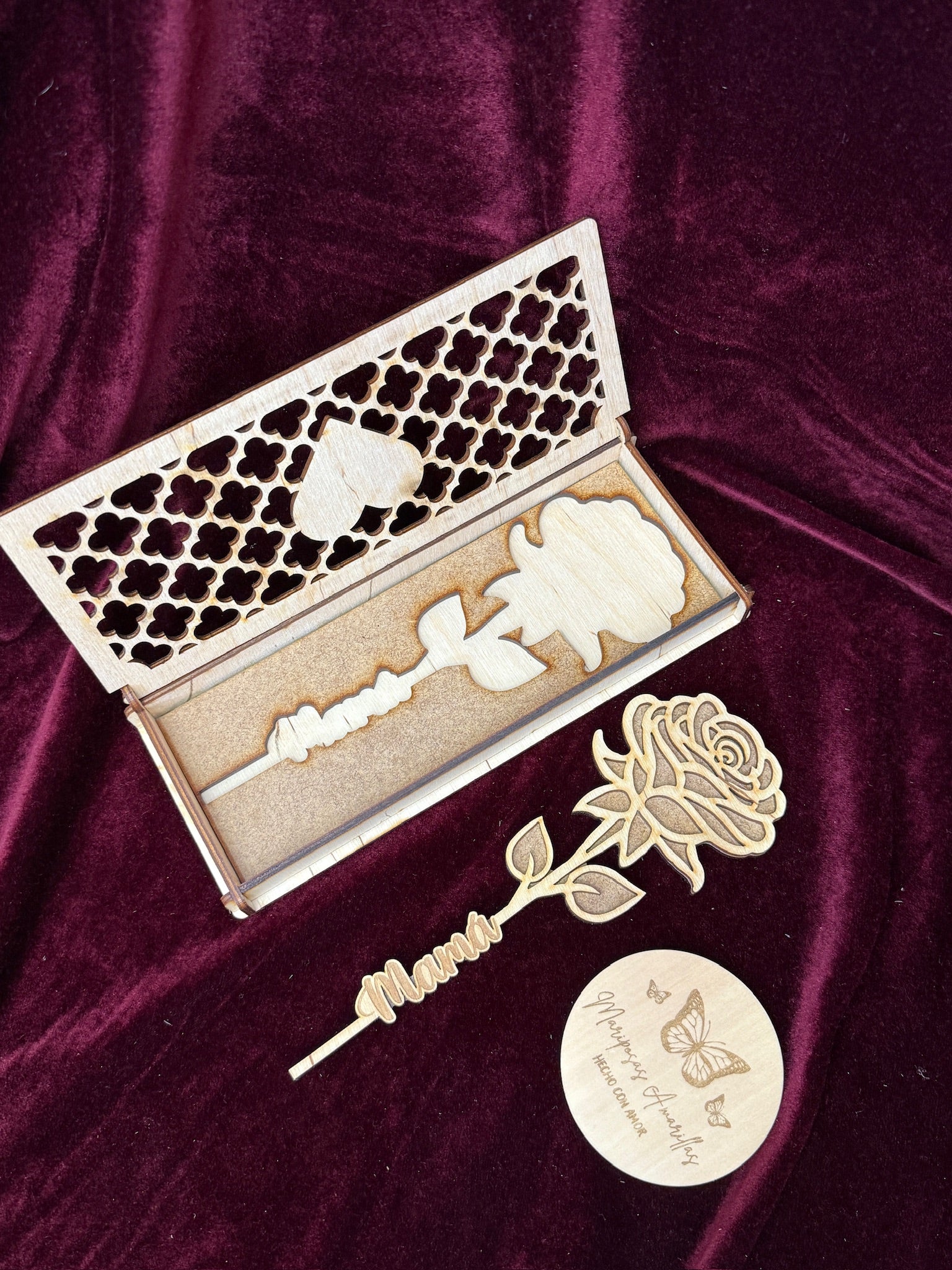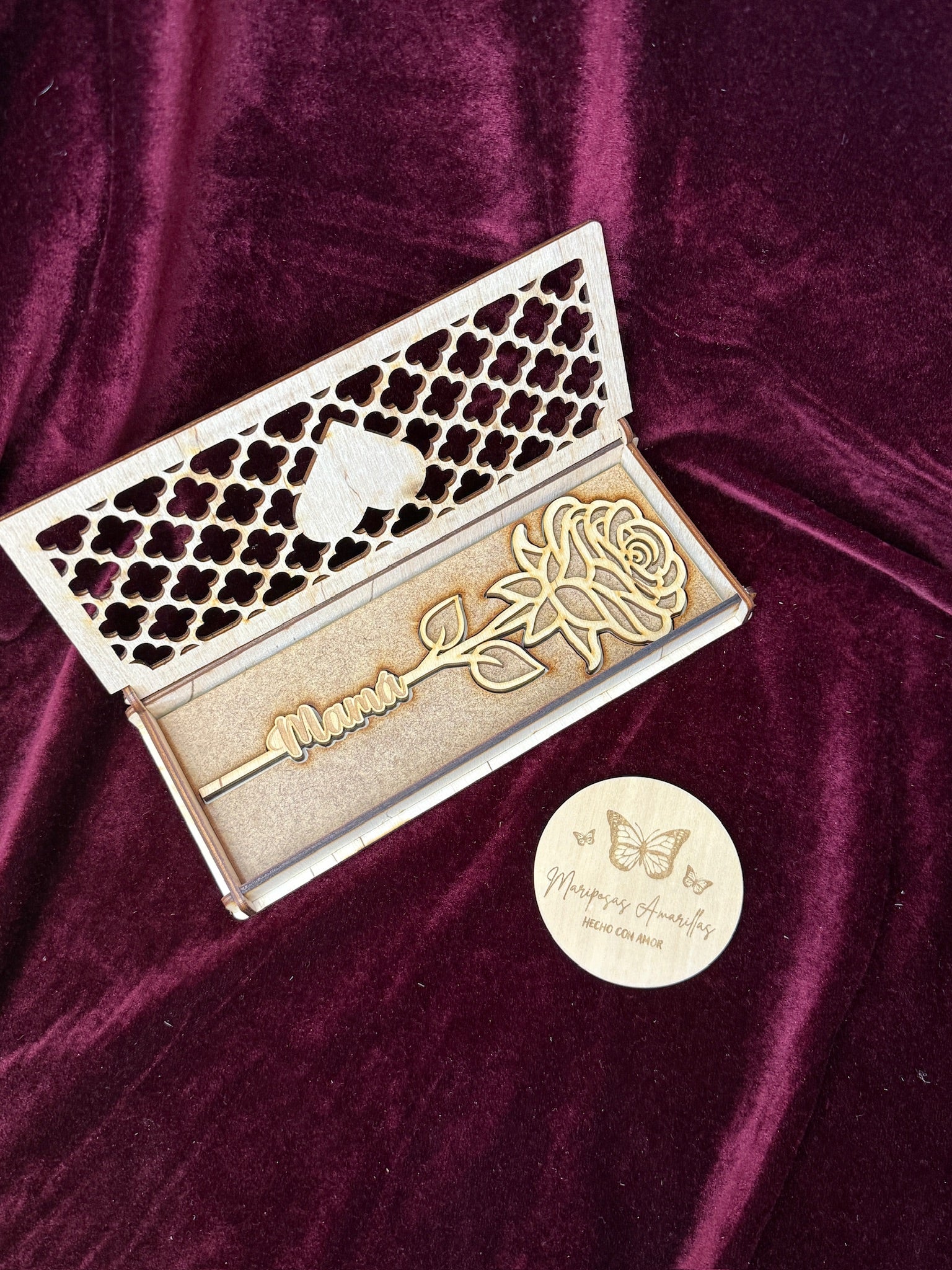 En su interior, encontrarás una joya especial: una rosa de madera, cuidadosamente elaborada a mano en dos capas (abedul y MDF) para lograr un hermoso contraste de tonos y texturas. En su tallo, lleva grabada con precisión la palabra “mamá”, como símbolo del amor y la gratitud eterna.