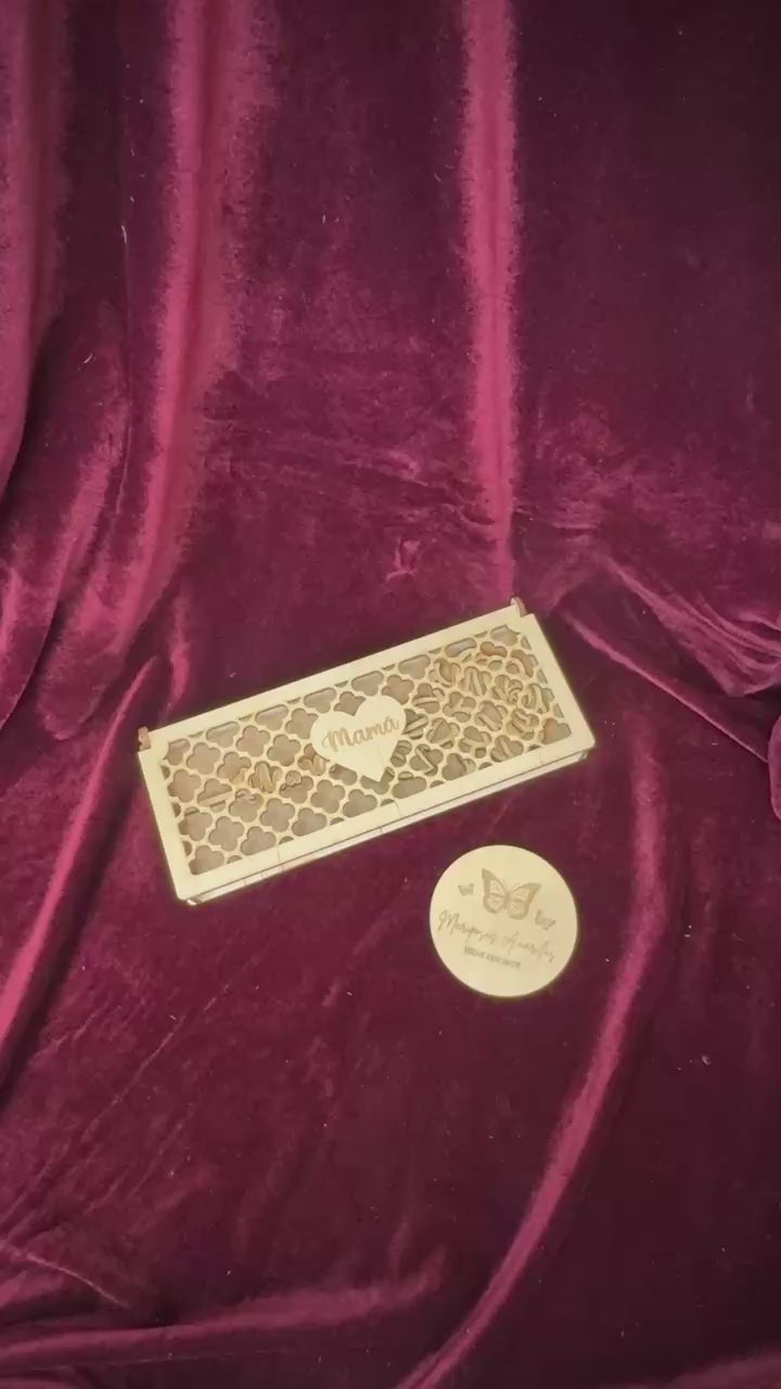 Un regalo lleno de significado, diseñado para emocionar y perdurar. Este pack incluye una elegante caja-joyero fabricada en madera de abedul, con apertura superior y una tapa decorativa tipo celosía, que presenta un delicado diseño con forma de corazón personalizable con el nombre que elijas. Un detalle único y artesanal, ideal para sorprender a mamá.