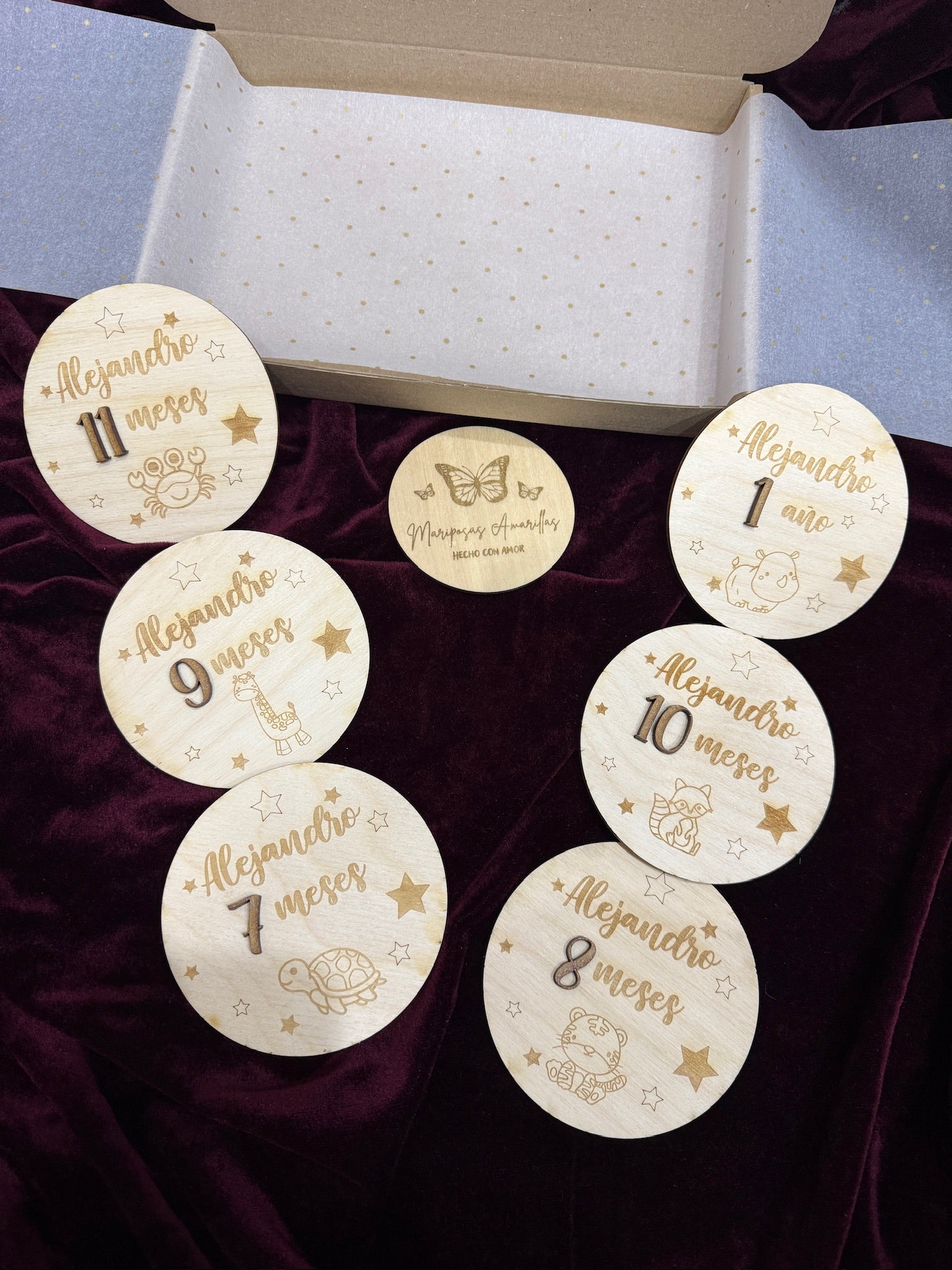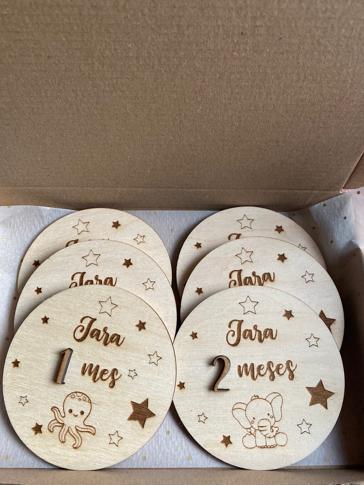 Celebra el crecimiento de tu bebé mes a mes con este hermoso set de placas de madera grabadas a láser. El pack incluye 6 placas de madera de abedul, cada una grabada por ambas caras, cubriendo así los 12 primeros meses del bebé, desde su nacimiento hasta el primer cumpleaños.